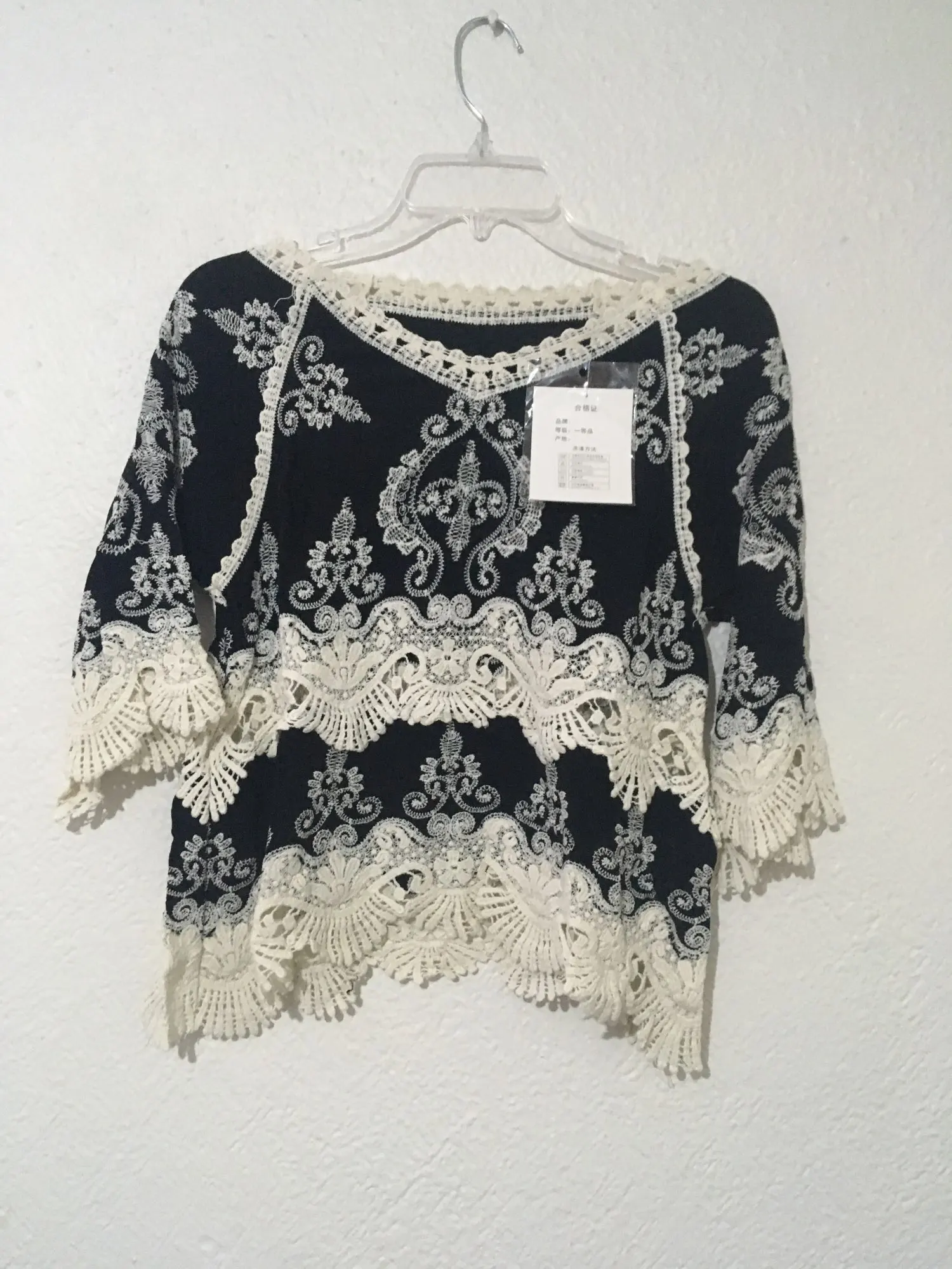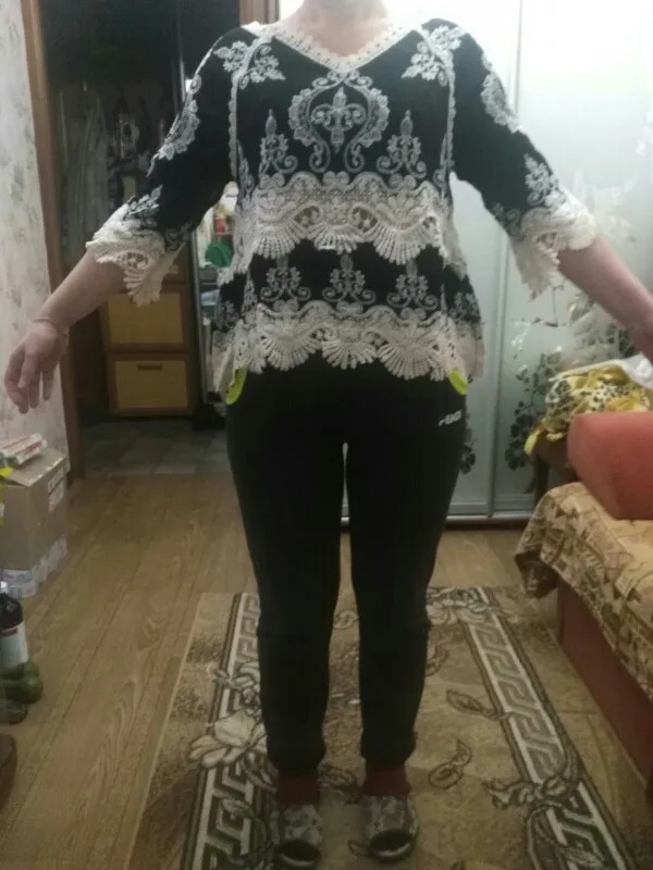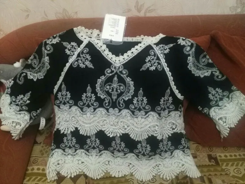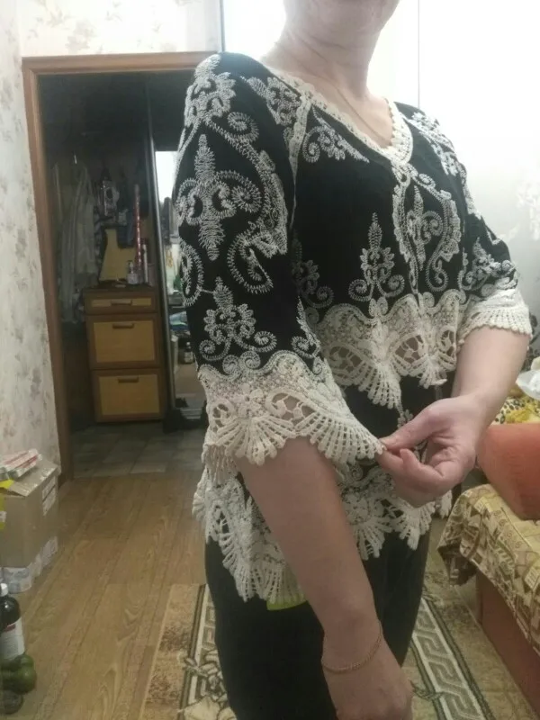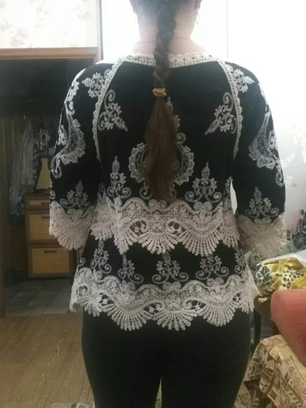Заказ пришел за две недели. Красивая, качественная кофточка. Ткань тоненькая, кружево качественное. Заказывалась на параметры: рост 165 сантиметров, обхват груди 90 сантиметров, обхват талии 73 сантиметров, обхват бедер 93 сантиметров. Спасибо продавцу за быструю отправку, качественный товар.
