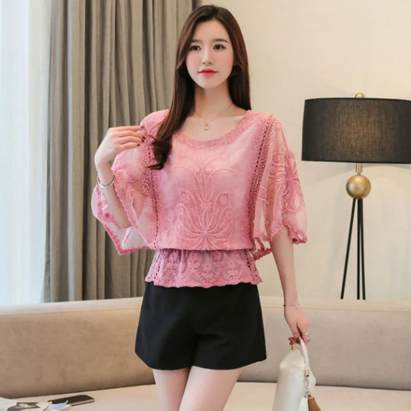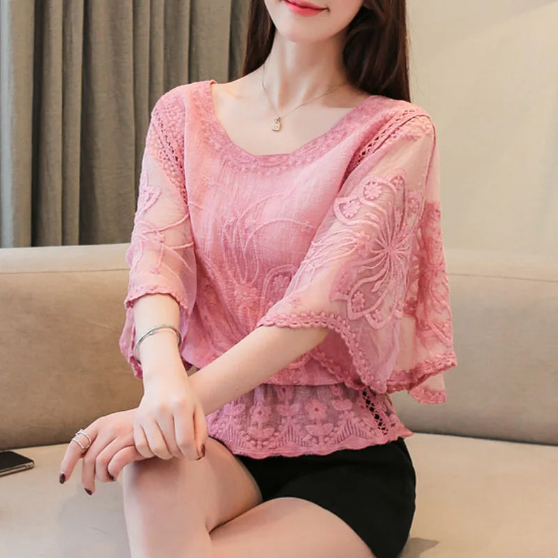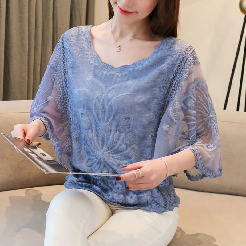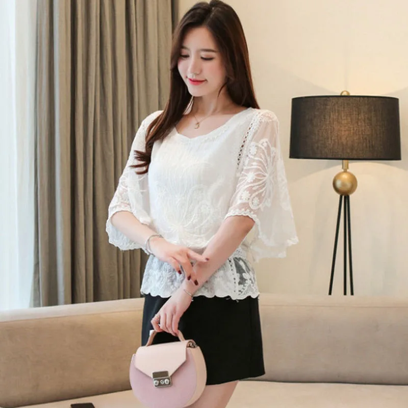 2021, модные летние топы, кружевная блузка, женская рубашка, размера плюс, Сексуальная кружевная рубашка с расклешенным рукавом, женская одежда, Blusas 4073