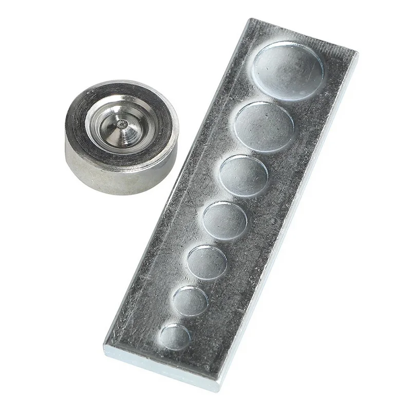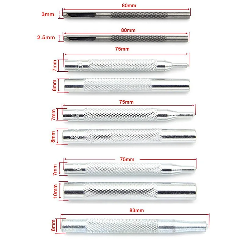 Набор включает в себяОснование 7 в 1: 6 мм/7 мм/8 мм/9 мм/10 мм/12 мм/15 мм 2 пуансон: 2,5 мм и 3,0 мм Длинные ручки обеспечивают удобство во время изготовления и работы над вещами Изготовлен из прочного материала из углеродистой стали Материал: углеродистая стальПосылка включает в себя: 2x831 удар 2x633 удар
