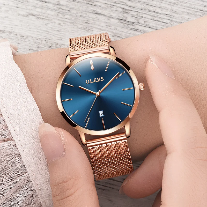 Женские кварцевые часы OLEVS, ультратонкие часы из розового золота со стальным ремешком и календарем, 5869