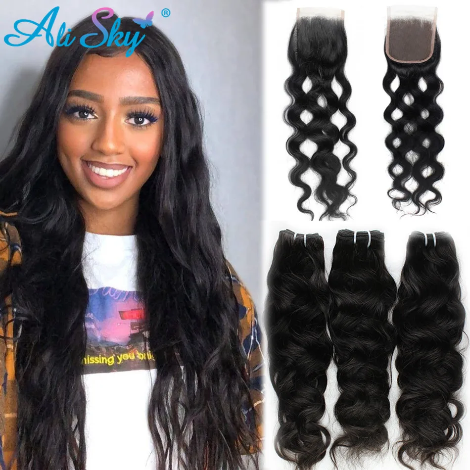 Alisky волосы 3 пряди с кружевной застежкой перуанские натуральные волнистые волосы плетение пряди с закрытием Человеческие волосы Remy волосы для наращивания