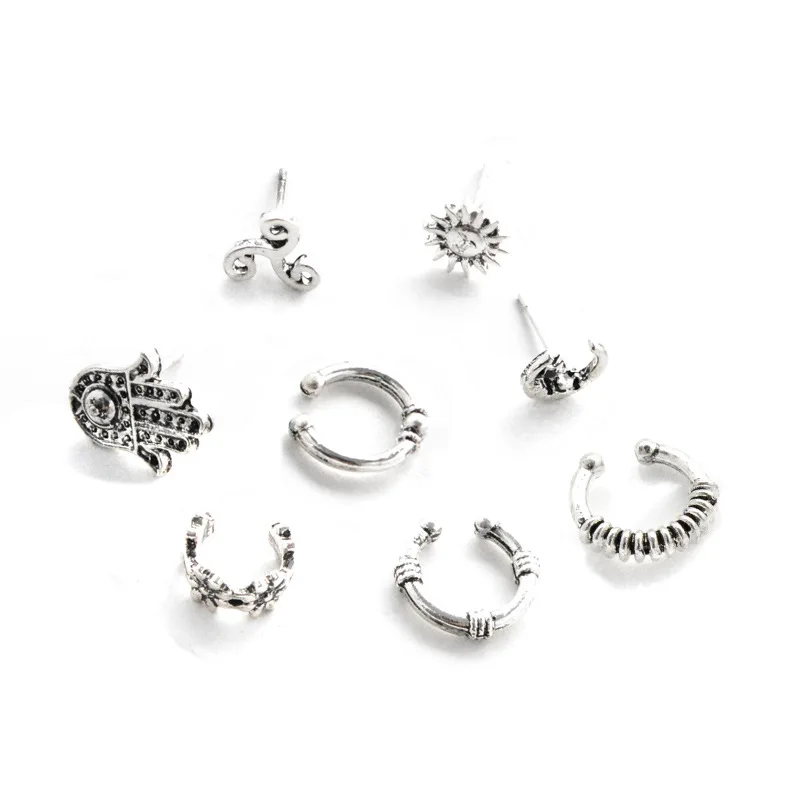 Набор серег в стиле бохо для женщин, Винтажные серьги-гвоздики в этническом стиле с декором листья, солнца, луны, звезды, серебряный Цветной Круг, 8 шт.компл.