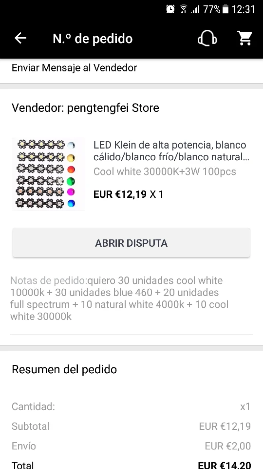 Очень плохое общение, вы размещаете заказ и отправляете то, что хотите, я посылаю все одинаковые светодиоды, но 5 разных типов, я не рекомендую покупать что-то в этом магазине, вы открываете спор, и они говорят вам вернуть его, и он стоит больше доставки, чем продукт Всего афера