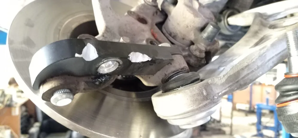 Сама пластина норм, но без доработок не обошлось. Итак, автомобиль е36 Compact, на рычагах Е46, рулевая рейка z3 E36. Стандартные наконечники от е36 не зафиксировать в этой пластине, так как диаметр отверстия огромный. Толщина пальца нужна как на Е46, но эти наконечники длинные и поэтому колеса в расхождении, даже если использовать всю резьбу тяги. Методом подбора прикрутили наконечники от е53 дорест, предварительно доработав отверстие. Прошлись ступенчатым сверлом до 18 мм, ступеньку сгладили шарошкой по металлу. Наконечник зафиксировался в конусе. При полном вывороте пластина упиралась то в рычаг, то в наконечник. Доработка по месту шарошкой. Конец.