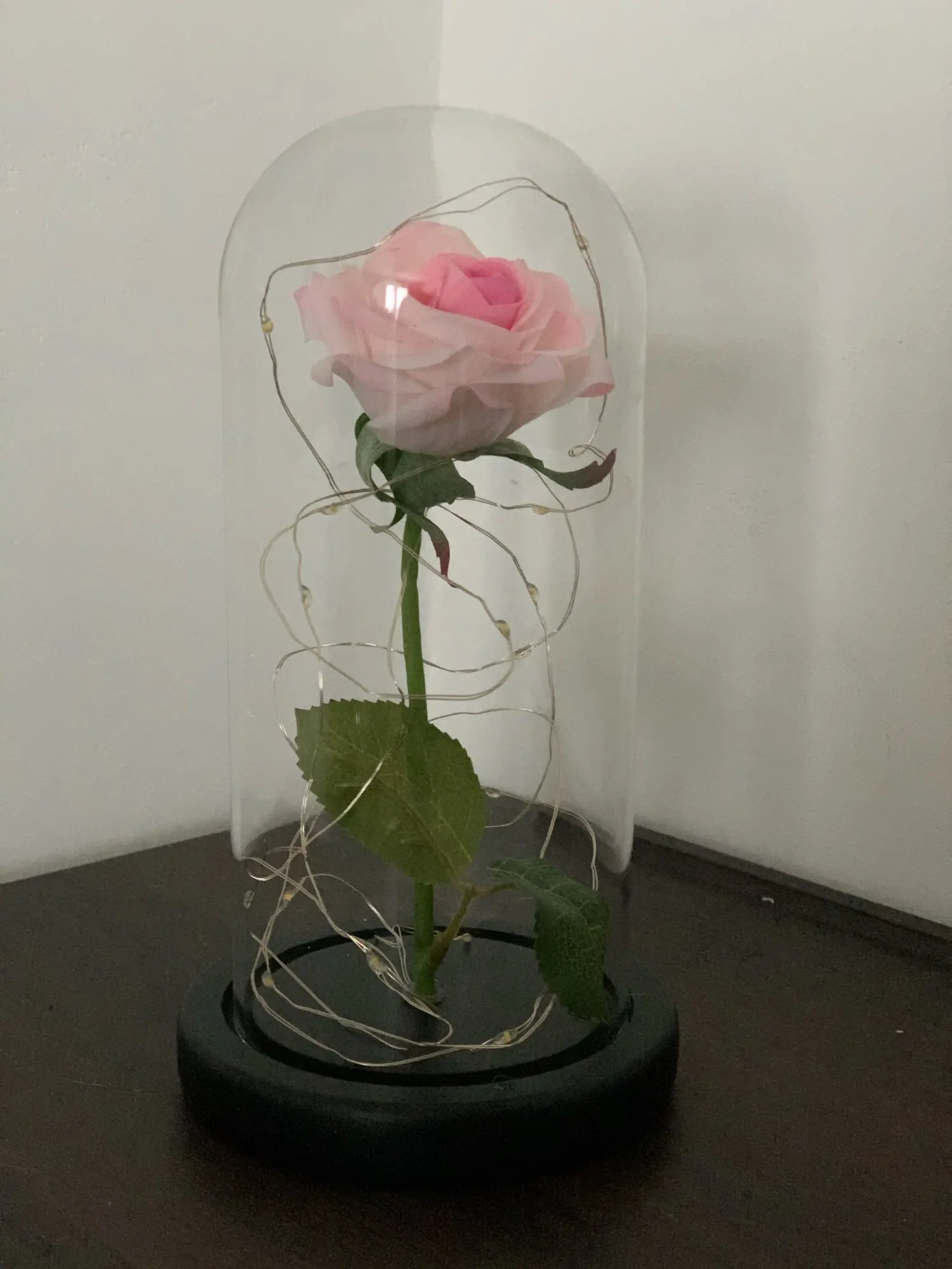 Розовый внутри стеклянного купола не имеет никакого качества .. Свет трудно установить внутри. Основание легко снимается с купола. Стеклянный купол был грязным. Хороший подарок, но не очень хорошего качества. В связи с ценой. (батареи не включены для включения света)