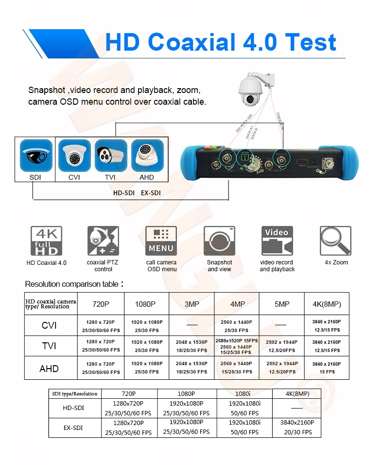 5MP TVI, 4MP аналоговая камера высокого разрешения, 4MP CVI камера испытания, 4xzoom, видео запись и воспроизведение, коаксиальный PTZ управление и кнопка вызова экранного меню на многих языках.