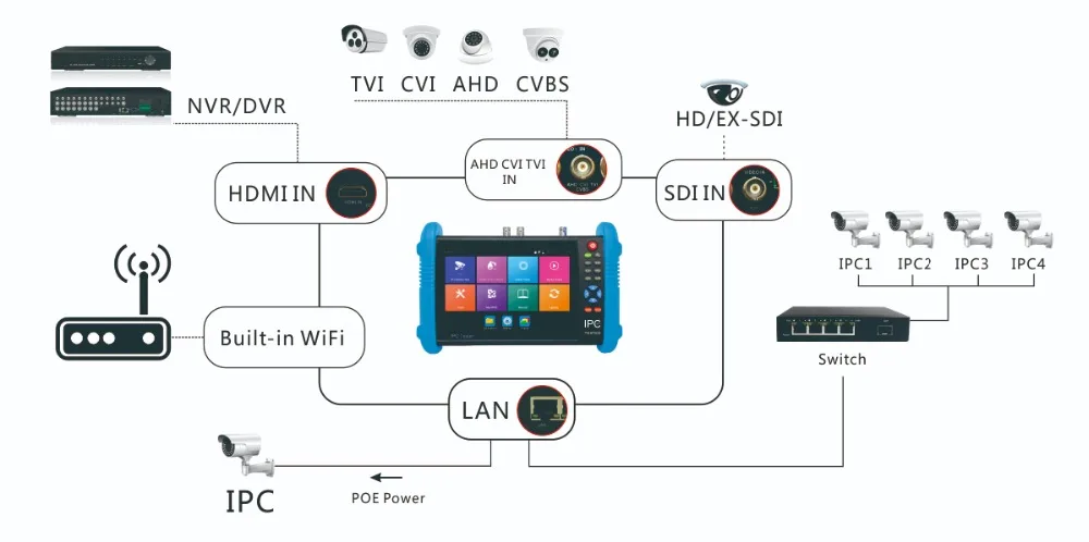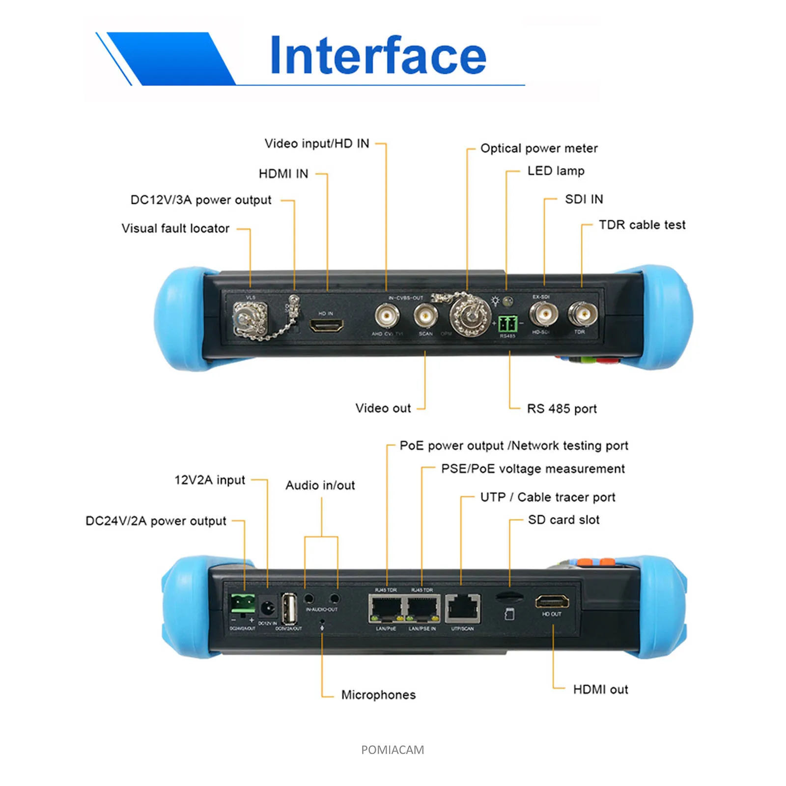 Другие функции включают в себя предоставление 24 Вт мощности PoE для вашей камеры, HDMI вход и выход, тест на петлю CVBS, тестирование IP и аналоговый одновременно, светодиодный фонарик, DC 12V 2A выходная мощность и многое другое.