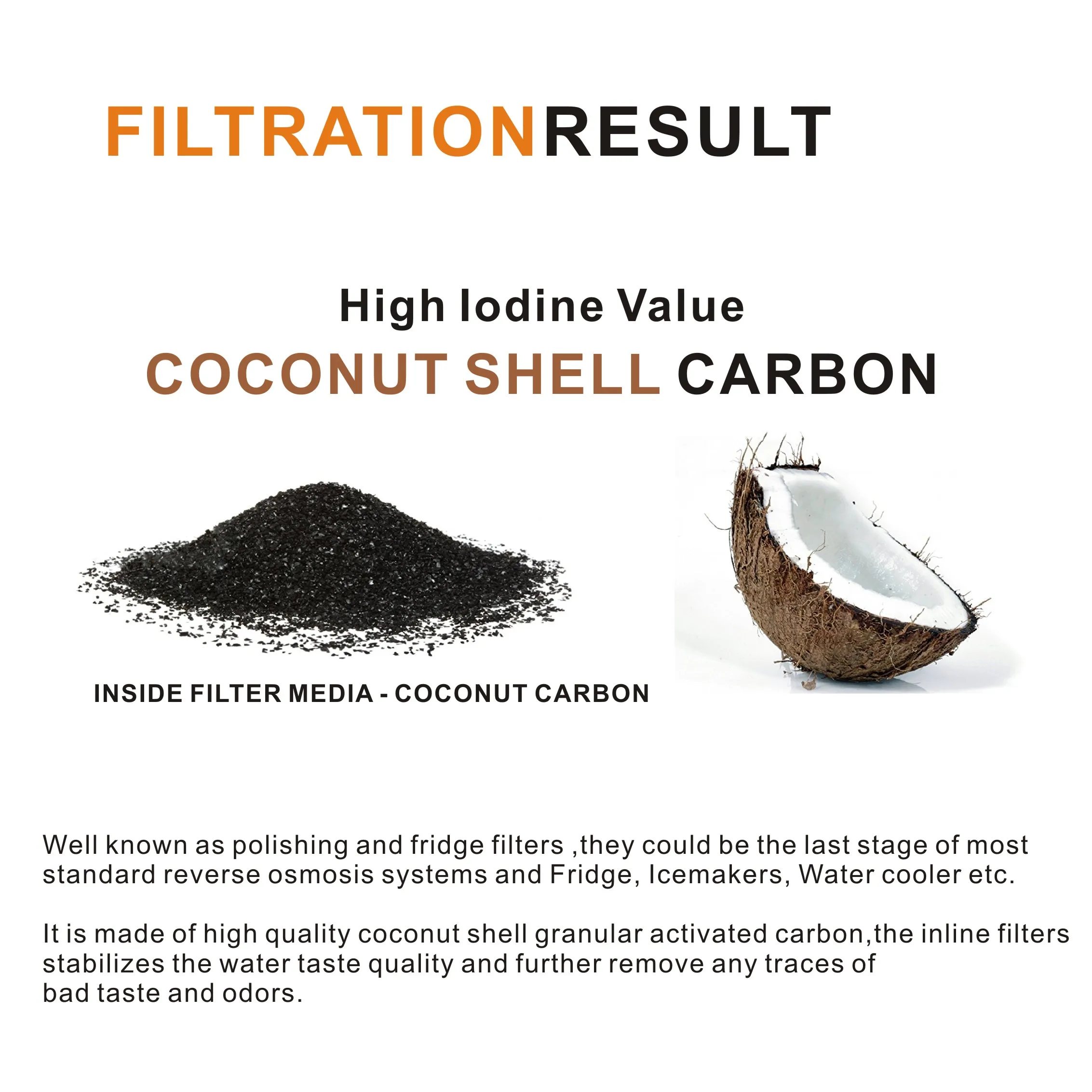 Встроенный кокосовый угольный фильтр для воды с 1/4 "быстрое соединение предназначены для удаления неприятного вкуса и запаха и уменьшения отложений для получения более чистой, ясной, лучшей дегустации воды. Встроенный кокосовый карбоновый фильтр для воды легко устанавливается на линии воды к автоматическому льдогенератору, кулеру воды, холодильнику, системе обратного осмоса или системе дозирования воды.