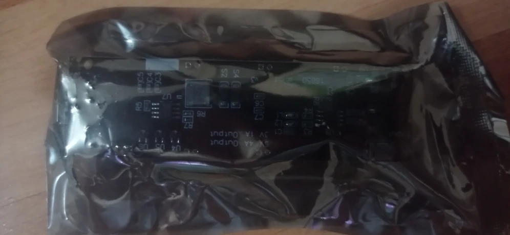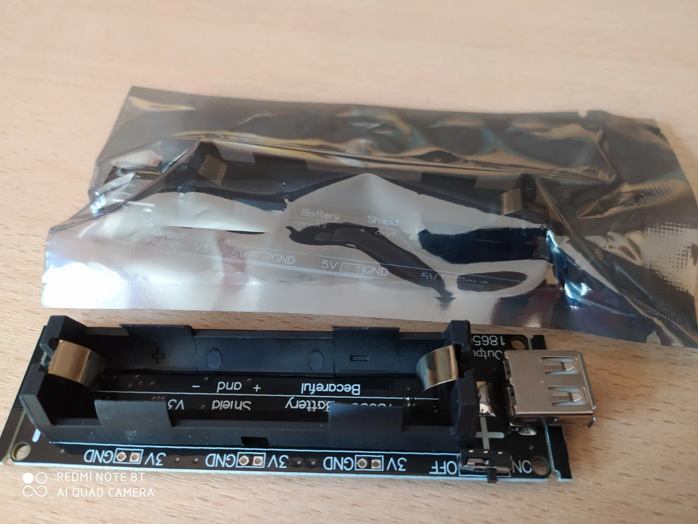 Для такого консолидированного мешка на почте выдали фирменный пакет АлиЭкспресс. Держатель аккумулятора, как положено, припаян полярностью наоборот :) Так что, ориентируемся по огромной маркировке на плате. Работает и 3,3 и 5 В, Зарядник TP4056A, повышайка FP6298. В общем всё хорошо.