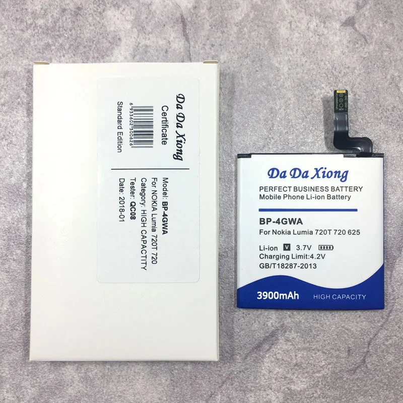 100% Оригинальный Da Xiong новый и высококачественный аккумулятор. Емкость:3900 мАч Напряжение: 3,7 V Тип: li-ion Используется дляNOKIA Lumia 720T 720 625 625h Безопасность и окружающая среда: двойные функции защиты. Двойная электрическая плата IC и PCB защищают от разрядки заряда и короткого замыкания. Наша батарея того же размера с оригинальной батареей. Два года гарантииПосылка включает в себя: