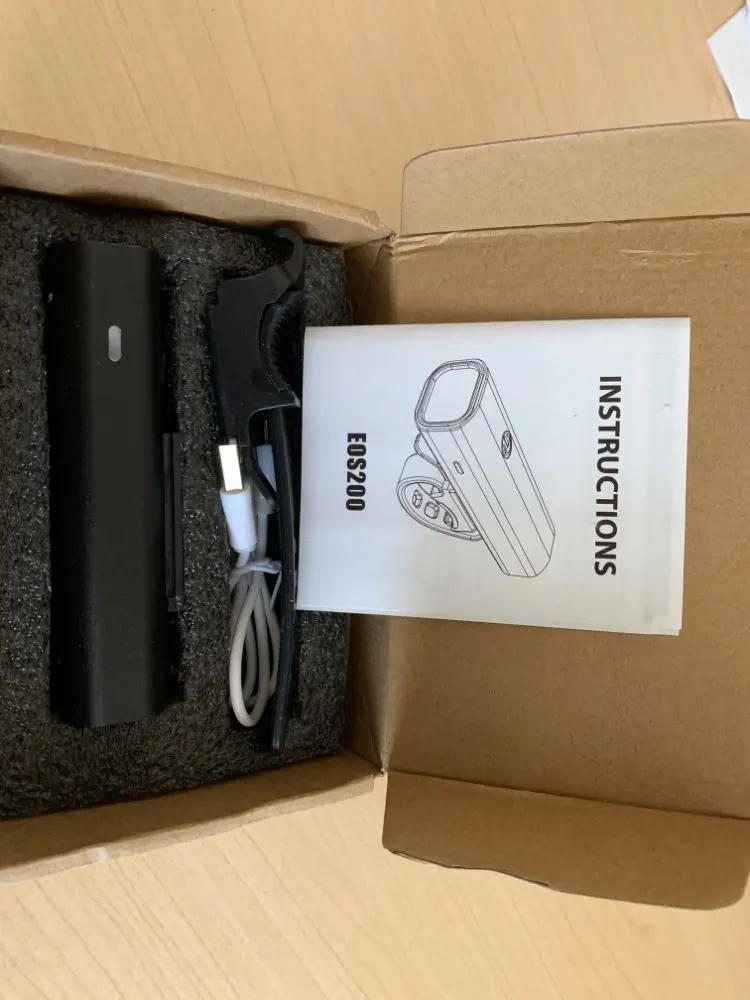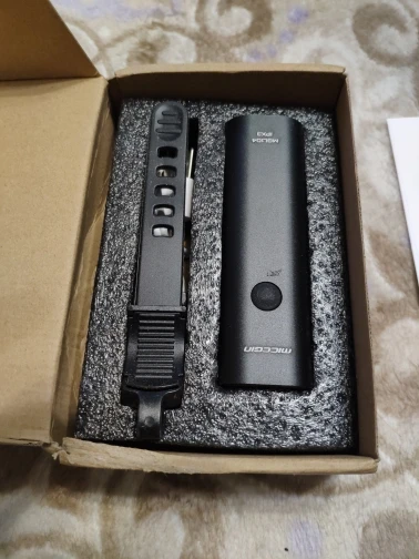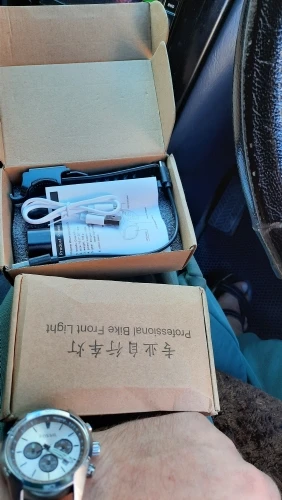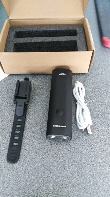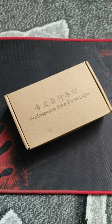 Отличный фонарик. Светит ярко. На фото максимальная яркость. Наклонён чуть ниже, чтоб освещало дорогу, можно и выше поднять. Однозначно рекомендую к прогулкам на велосипедах. Коробки не фотографирую, смысла нет, принесли домой доставку. Все цело.