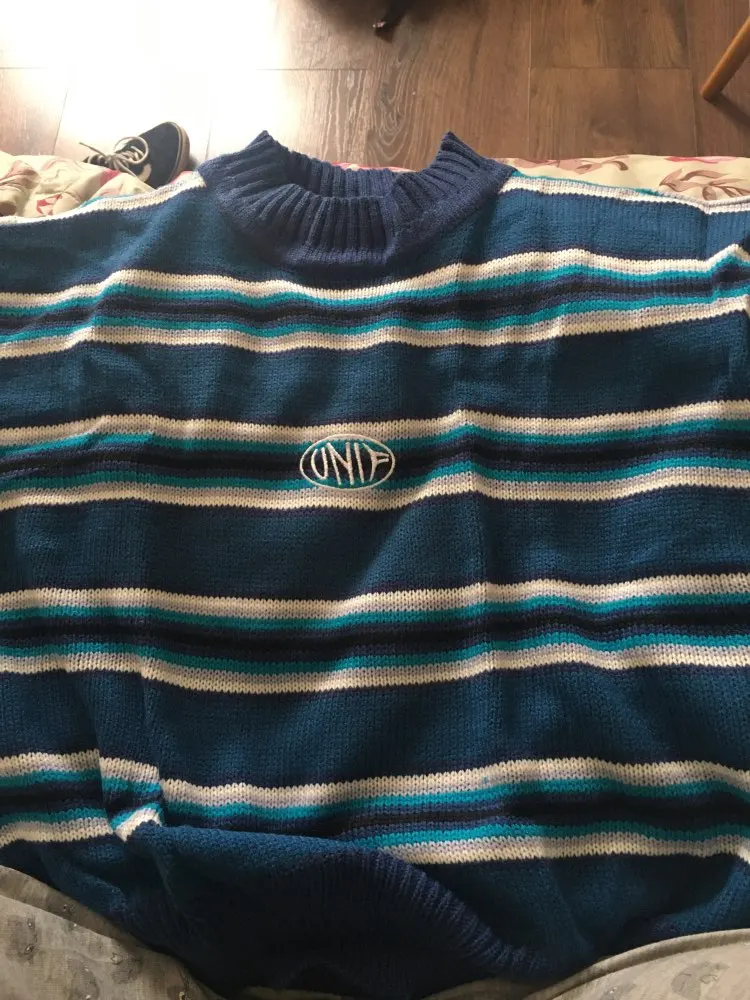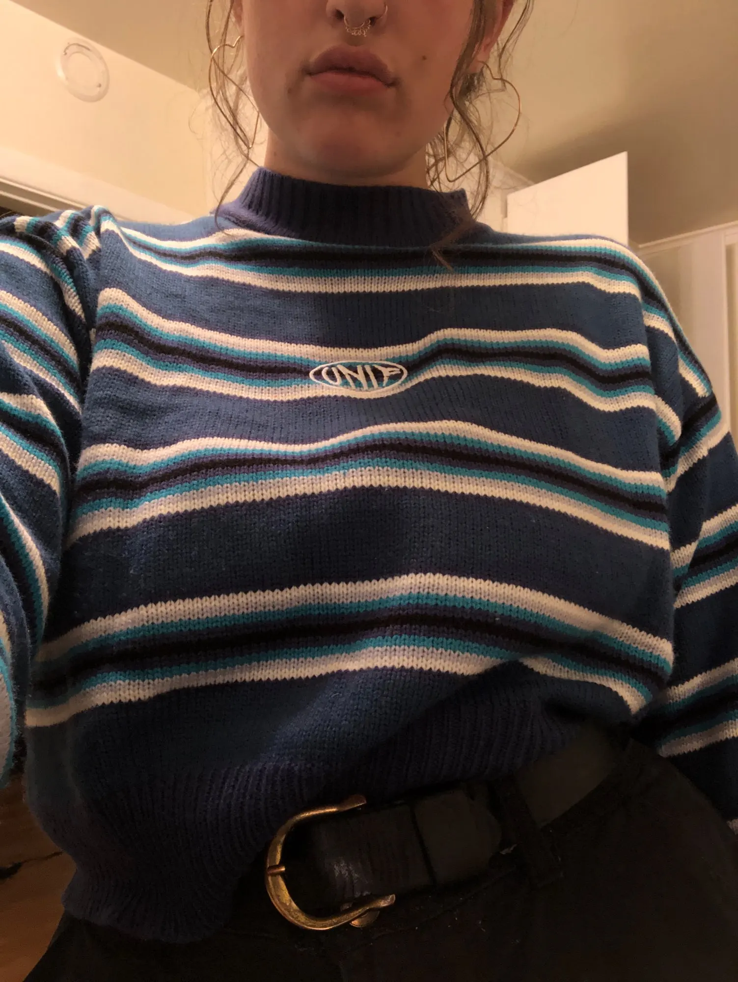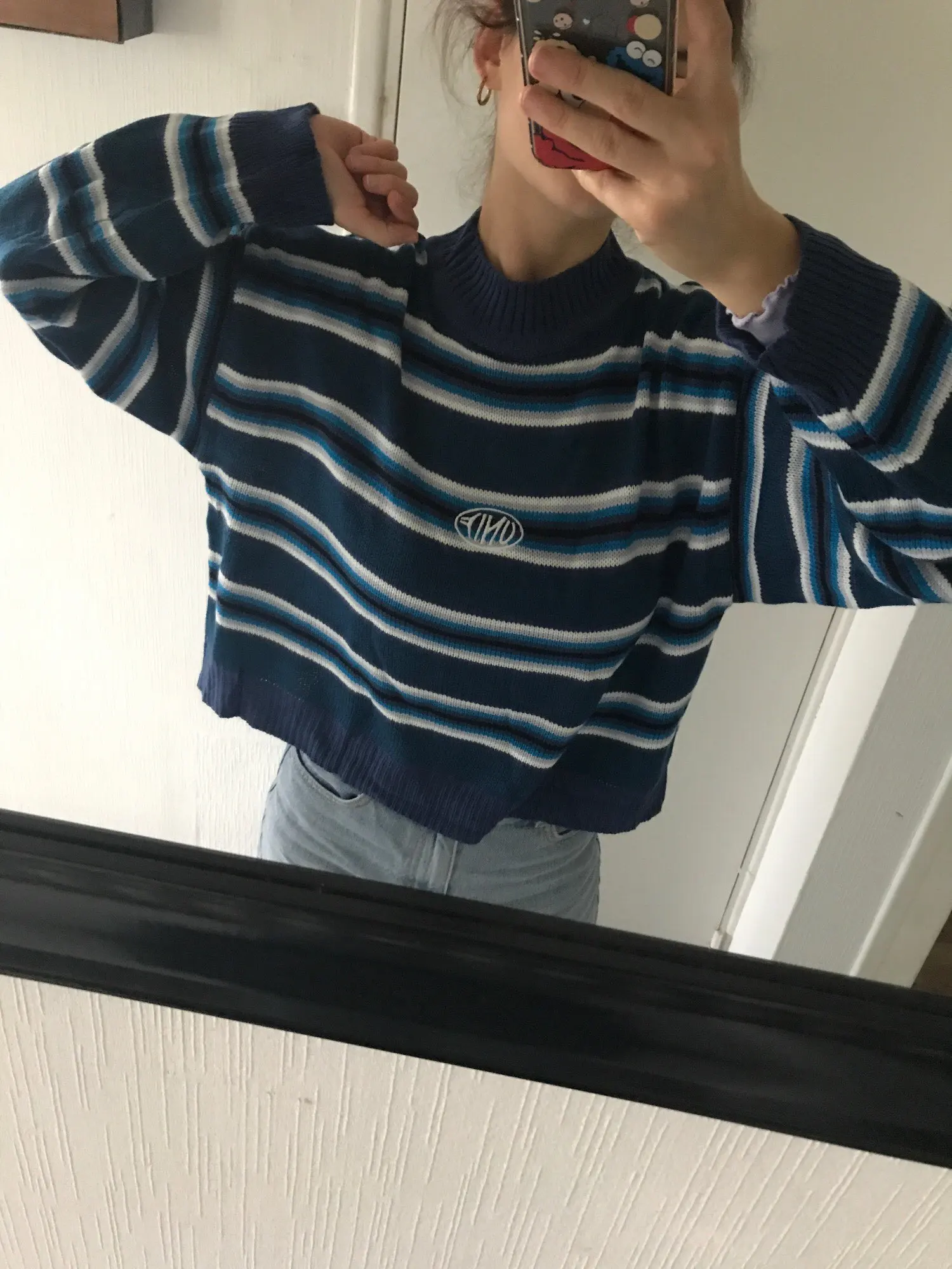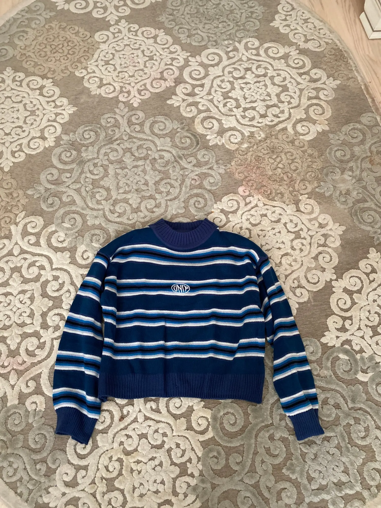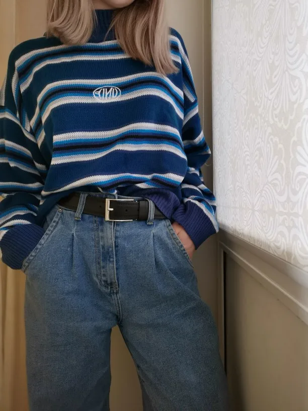 тоненький свитер, отличается от фото цветом - полоски не темно синие, а голубые. в целом, неплохо
