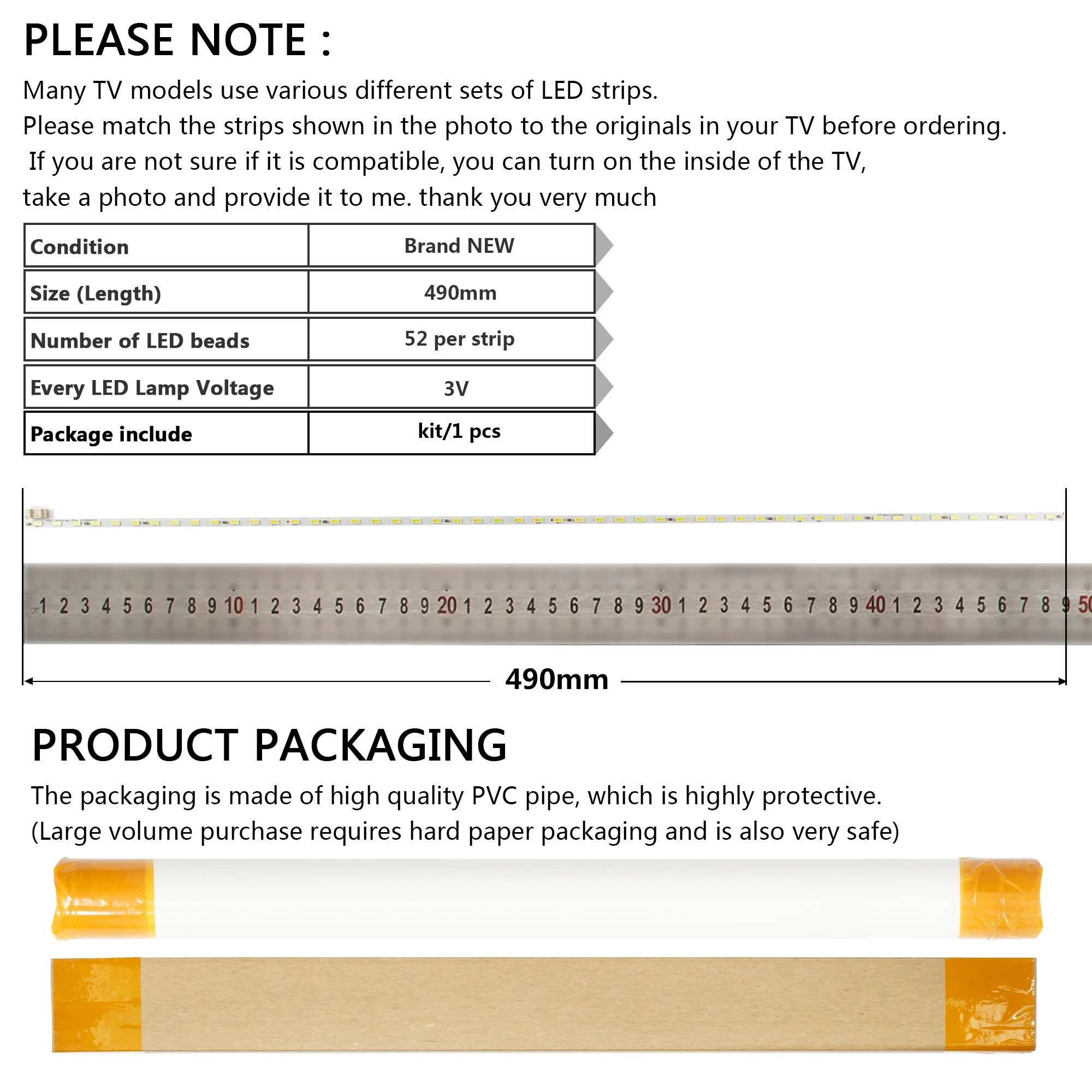 1. Перед заказом сравните полоски, показанные на фотографии, с оригиналами вашего телевизора. Если вы не уверены, совместим ли он, вы можете включить внутри телевизора, сделать фотографию и предоставить его мне. Большое спасибо.