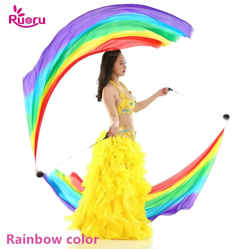 Женская шелковая Фата для танца живота ruoro, 100% шелк, 2 шт. + 2 шт. пои, цепочка-шарик для танца живота, вуаль пой, реквизит для сцены, Радужный градиент цвета