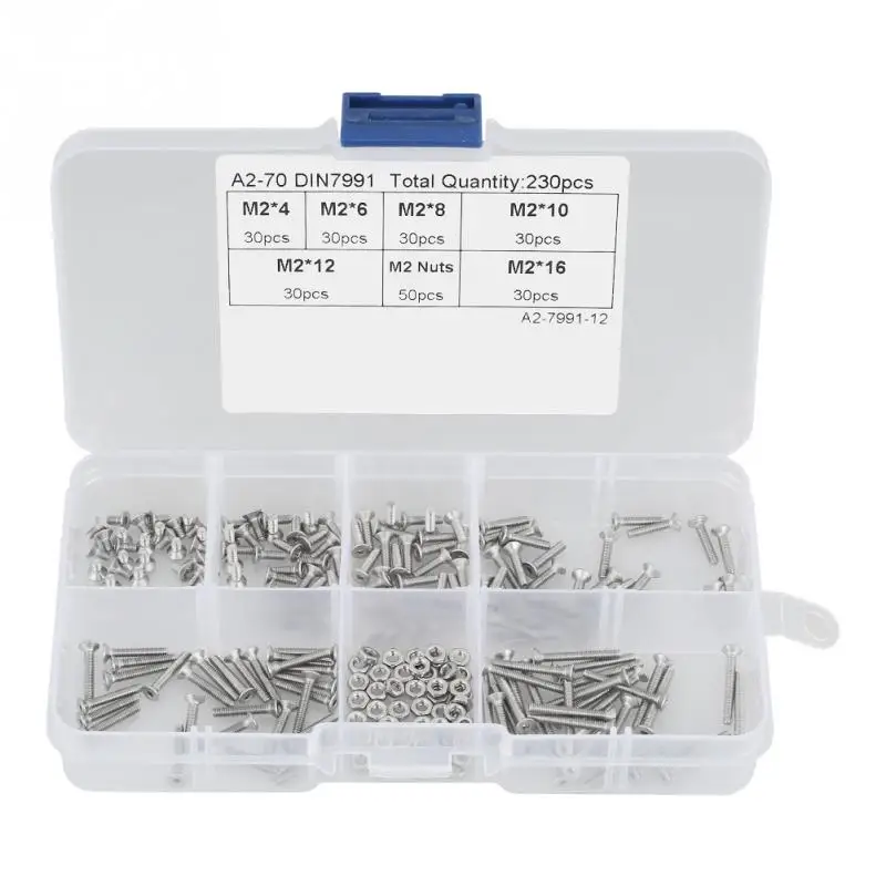 230 шт М2 набор гаек и болтов 304 нержавеющая сталь плоская головка болта шурупы гайки набор с коробкой из дерева
