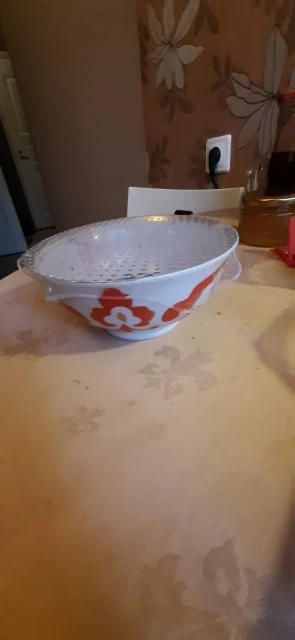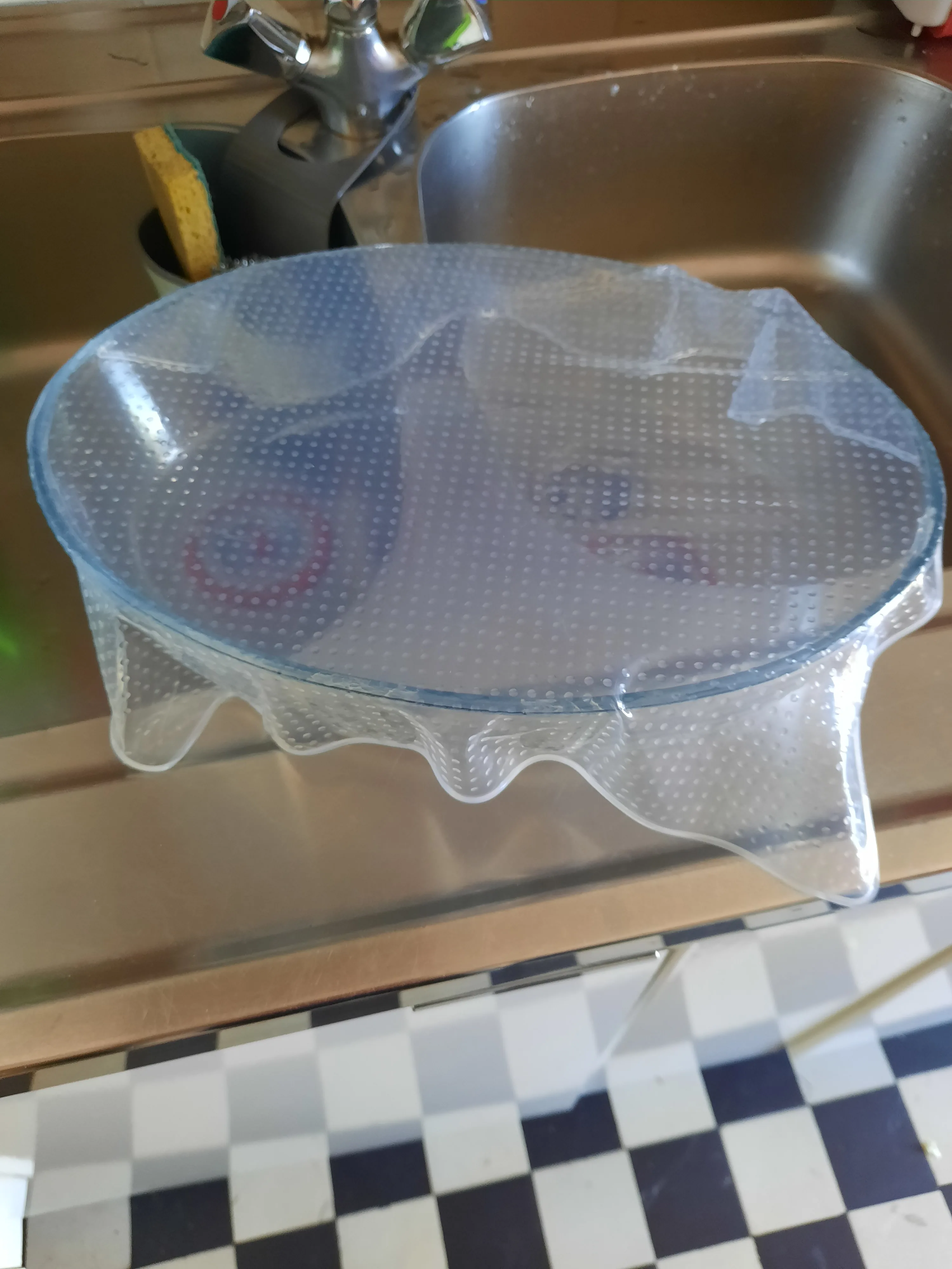 Очень хорошая, держится на посуде. Подходит, чтобы прикрывать посуду, когда ставишь в микроволновку. Я сначала не поняла, как ей пользоваться, она не для всей посуды подходит. Но для многих видов - да (пластик, стекло, керамика, металл, если без бортика - хорошо держится). На фото этой штукой прикрыта сырная тарелка.