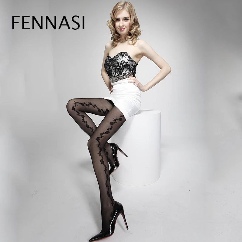 Женские колготки FENNASI, жаккардовые, в полоску, с цветочным узором, сексуальные, нейлоновые, тонкие, черные