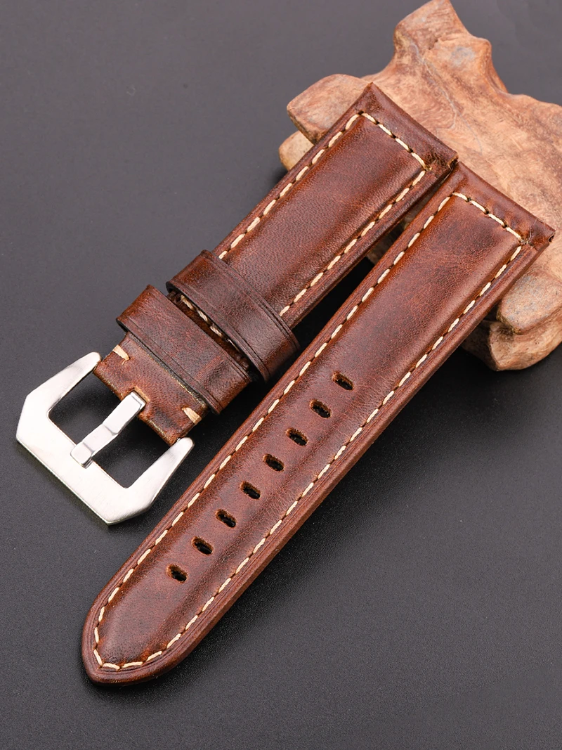 Ремешок из натуральной кожи для наручных часов, винтажный темно-коричневый браслет с серебристой черной пряжкой из нержавеющей стали, 20 мм 22 мм 24 мм