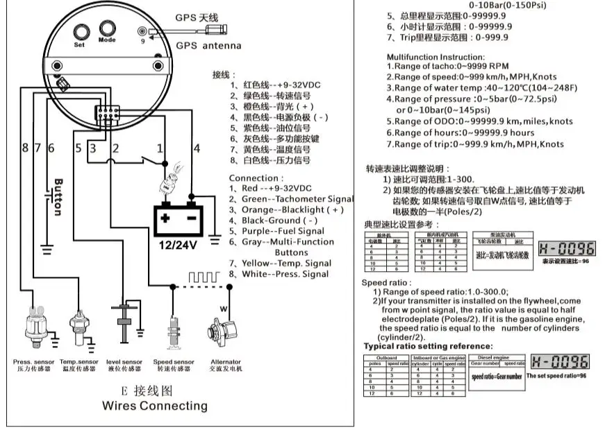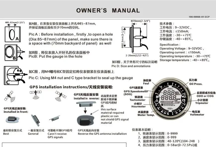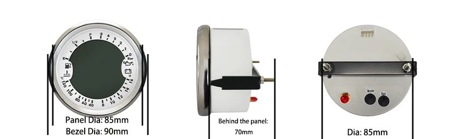 -Фиксирующий Размер: 85 мм (3-3/8 ")-Подсветка: красный, оранжевый, зеленый, желтый, оливковый, синий, фиолетовый, белый, автоматический (вы можете нажать кнопку, чтобы изменить)-Функции:Диапазон оборотов тахометра: 0-9999 об/минДиапазон индикации спидометра: 0-999 (доступны узлы км/ч)Диапазон индикации температуры воды: 40-120 ℃ (104-248 ℉)Диапазон индикации манометра: 0-5Bar (0-72.5Psi)/0-10Bar (0-150Psi)Общий диапазон индикации пробега: 0-99999,9 (км милей морских миль доступны)Диапазон индикации счетчика: 0-99999,9Дальность индикации поездки: 0-999,9 (км/ч м/ч узлы доступны)Рабочее напряжение: 8-16VDC/18-32VDCРабочий ток: <150 мАРабочая температура: -30 ℃-75 ℃Температура хранения: -40 ℃-85 ℃Степень защиты: IP67
