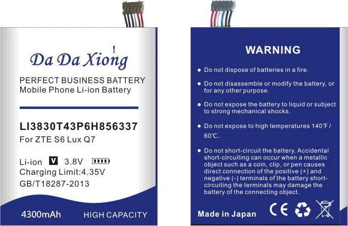 100% Оригинальный Da Xiong новый и высококачественный аккумулятор. Емкость:4300 мА · ч Напряжение: 3,8 V Тип: li-ion Совместимость: дляАккумулятор ZTE G719C N939St Qingyang 3 ZTE Blade S6 Lux Q7/-C Безопасность и окружающая среда: двойные функции защиты. Двойная электрическая плата IC и PCB защищают от разрядки заряда и короткого замыкания. Наша батарея того же размера с оригинальной батареей. Два года гарантииПосылка включает в себя: