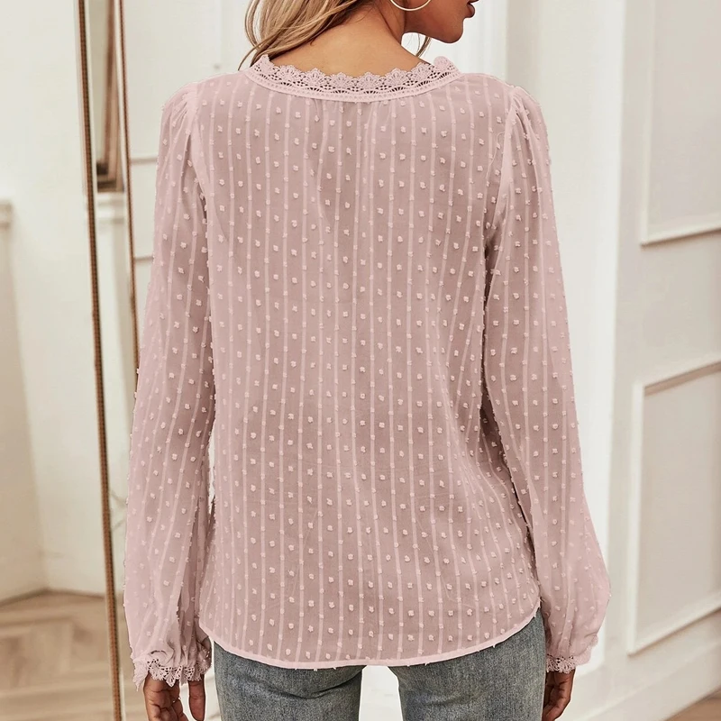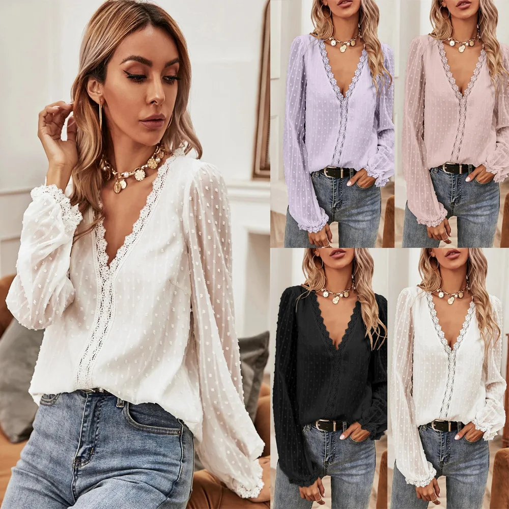 Новая весна лето кружевная шифоновая рубашка женские топы повседневная блузка с длинным рукавом с v-образным вырезом женская мода женская одежда Blusas 19025