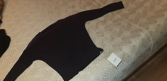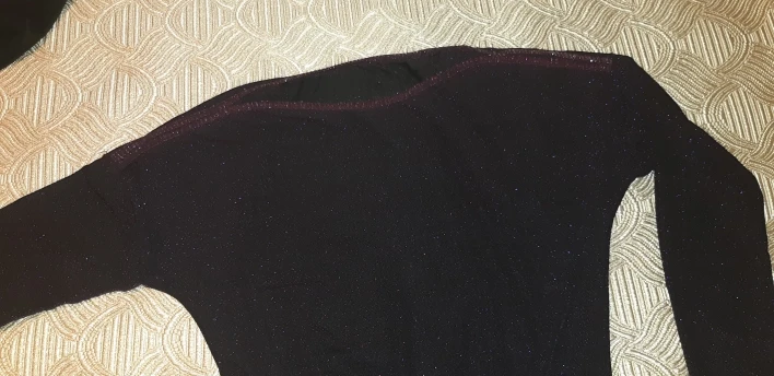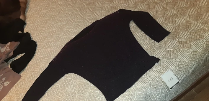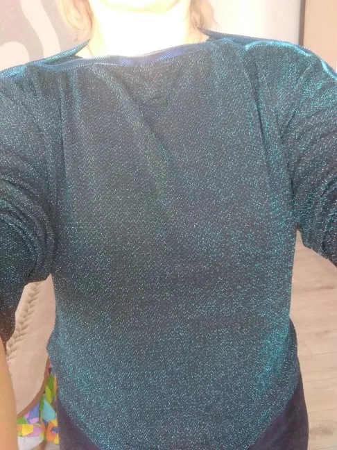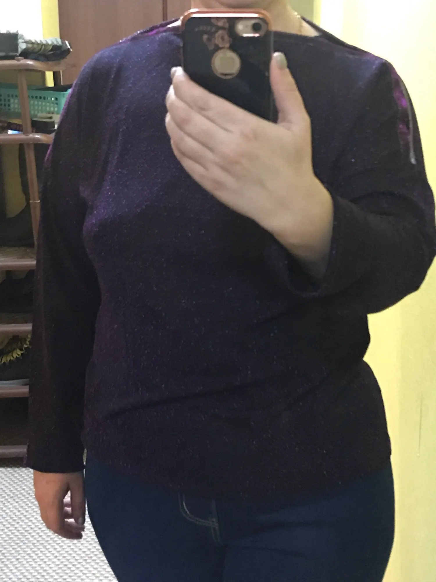 Кофта очень тонкая, на 46 взяла 48, подошло. Очень сильно красит и часть блёсток осыпалось. Брала по распродаже за 790 рублей. Шло очень долго.