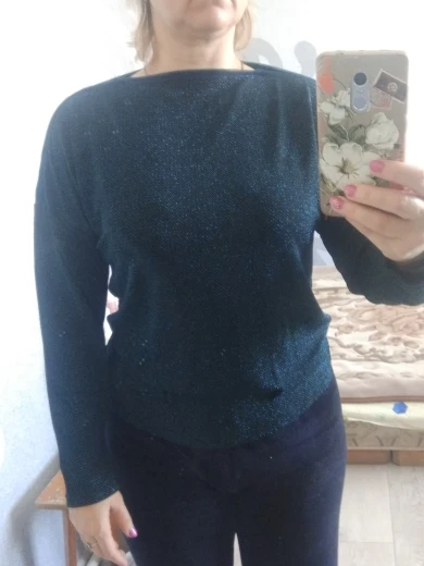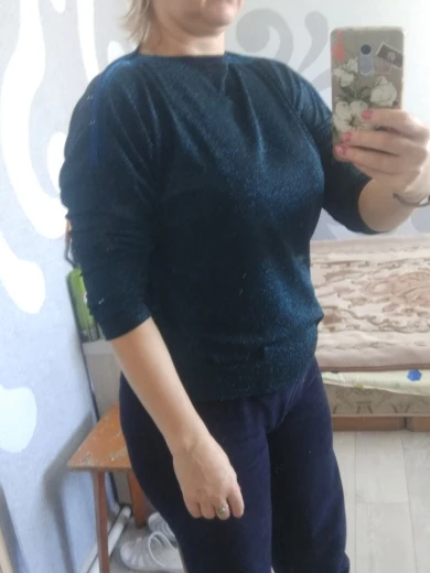 Кофта неплохая, с люриксовой нитью, цвет глубокий темно-синий. Рукав широкий, можно закатать на любую длину, свободная в меру. На 46 хорошо смотрится и сидит.