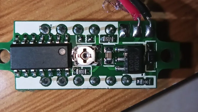 Добре, що хоча б один із замовлених з Китаю волтметрі виявився з підстройкою. Але кітайці тут заморочились і щоб цей вольт метр показував від 0 потрібно підпаяти провід на вільний пятак та перепаяти резистор позначений 303 на місце поруч. Я ще замінив цей резистор на 12ком.