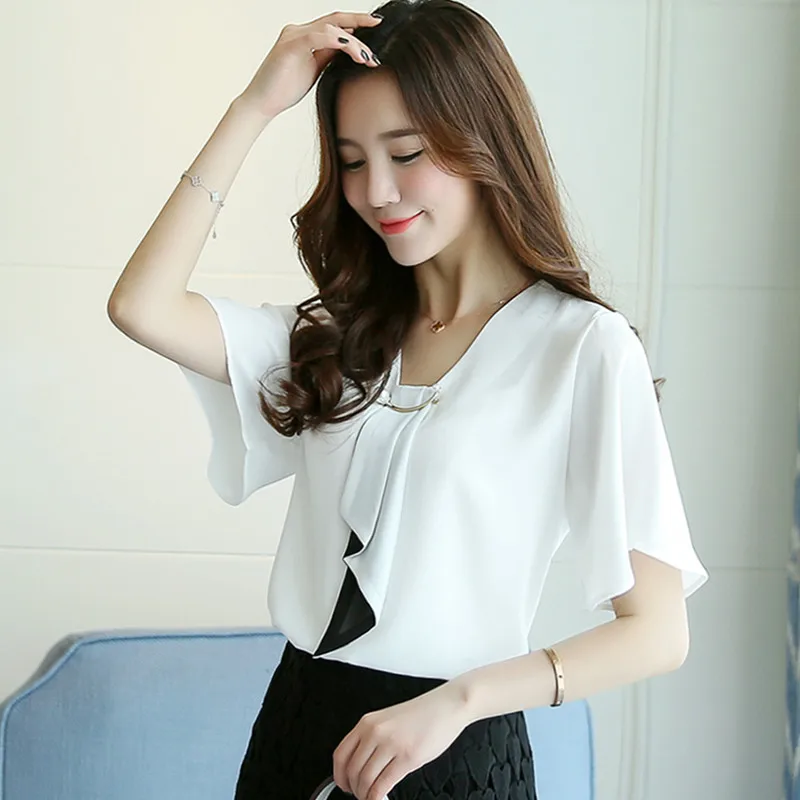 Новинка модная шифоновая женская рубашка, свободные женские топы с бантом, блузка с коротким рукавом, плюс размер, женская одежда, блузки D560 50