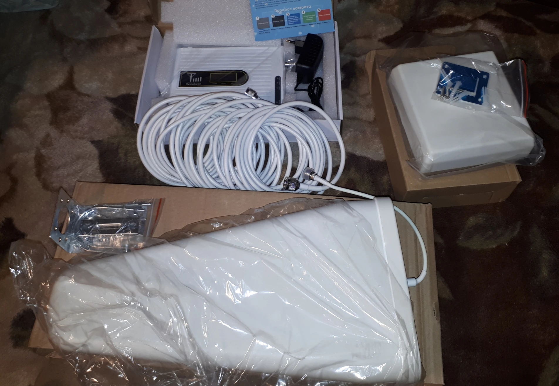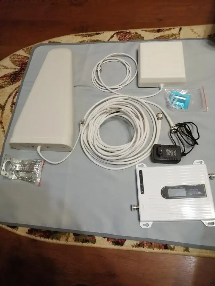 Очень быстрая доставка. Получил менее чем за неделю (Владимирская область). Товар хорошо упакован, в комплекте антенна внешняя, антенна внутренняя, антенный кабель, усилитель, блок питания, инструкция, крепёж. Испытываю менее недели. Если раньше бегал по дому ища три палки Н+, то с этим прибором появляется 4G и работает. В комнате 4х4 метра сеть отличная далее качество уменьшается. Дом в низине, пришлось поднять антенну примерно на 6 метров от земли, хотя на смартфоне 4G. Very fast delivery. Received in less than a week. Well packed, complete with external antenna, internal antenna, antenna cable, amplifier, power supply, instructions, fasteners. Experiencing less than a week. If I used to run around looking for three H+ sticks, then 4G appears with this device and works. In a room of 4x4 meters, the network is excellent, further the quality decreases. The house is in the lowland, I had to raise the antenna about 6 meters from the ground.