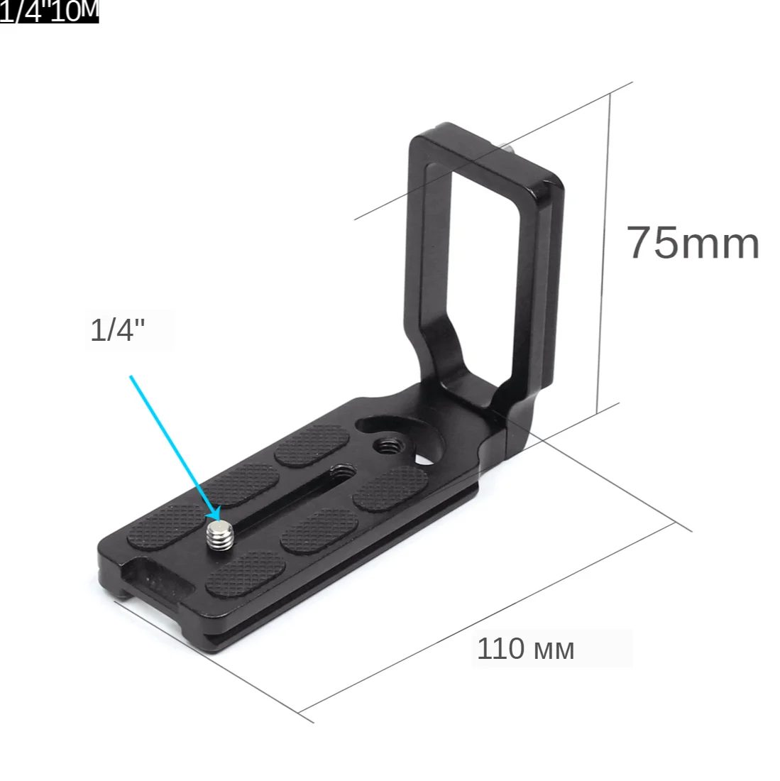 Толщина: 10 мм Размер: 110 мм x 75 мм Размер винта: 1/4 дюйма (6,35 мм) Материал: сплав алюминия Предохранительный винт установлен с обеих сторон, чтобы предотвратить случайное падение камеры. Особенности: вы можете изменить расположение винта, чтобы соответствовать различным камерам. Данная быстросъемная Г-образная конструкция была разработана для совместимости с быстросъемными конструкциями других брендов. Подходит для большинства шаровых головок. Изготовлен из превосходных материалов высокого качества.