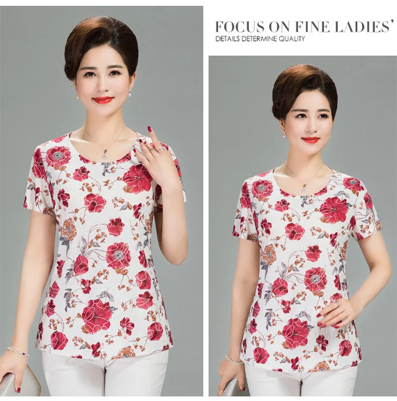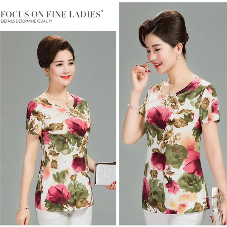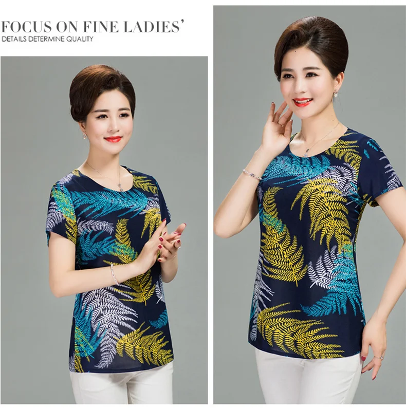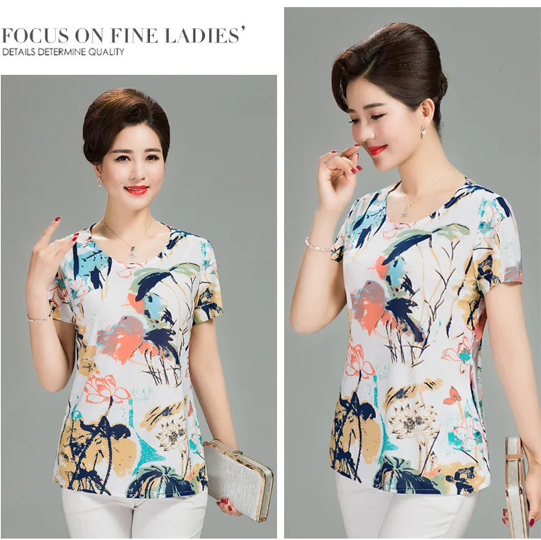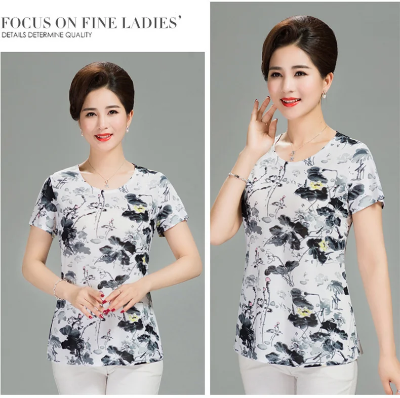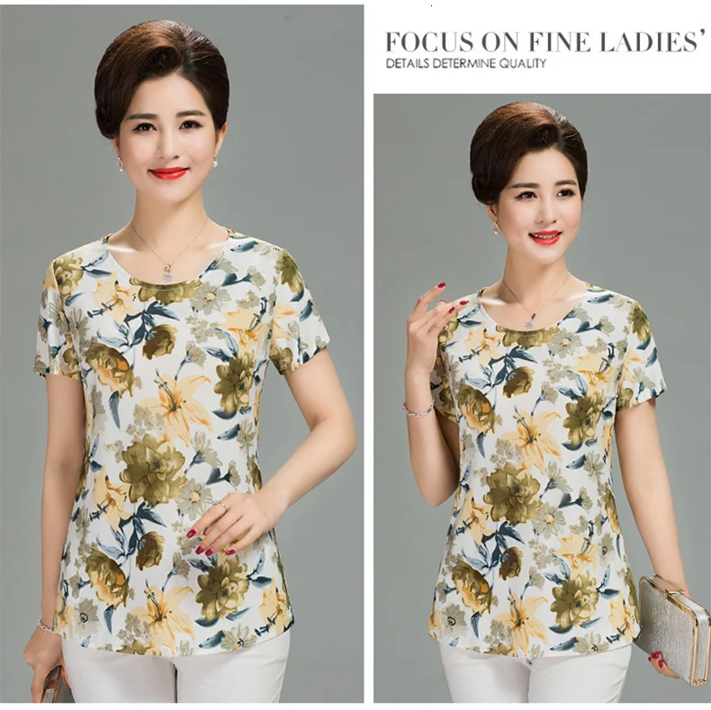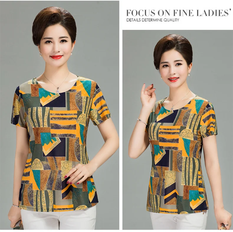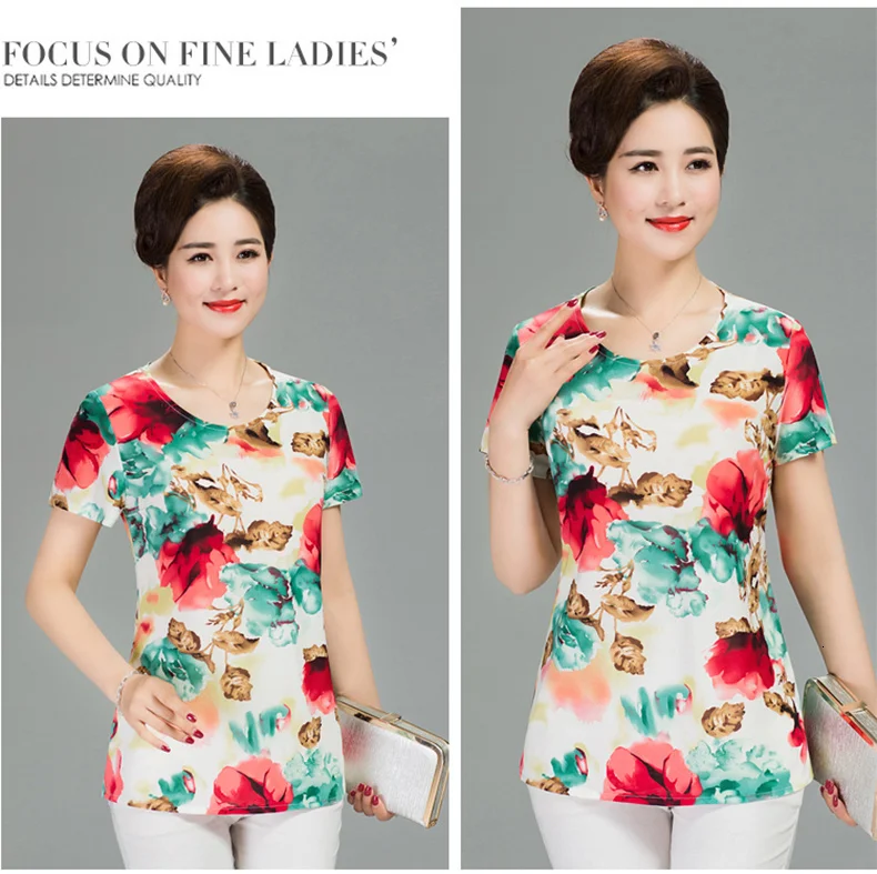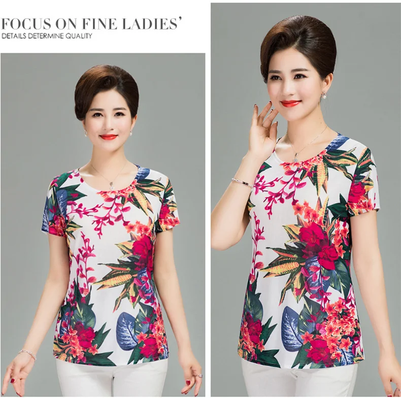 Женская футболка, большие размеры 4XL, футболка из молочного шелка с принтом и коротким рукавом, модная одежда для мам среднего возраста, 2020