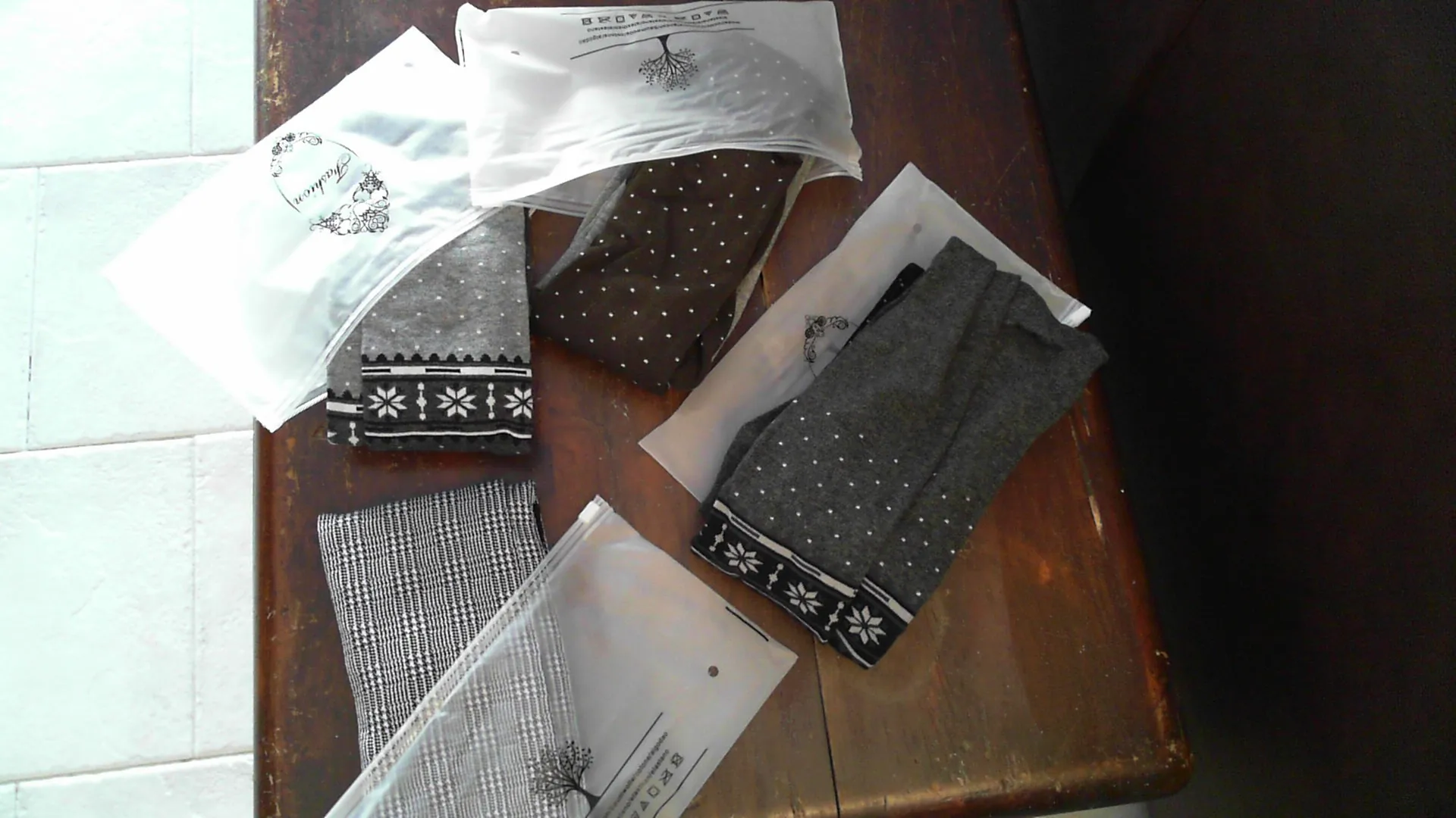 These tights are as pictured and described. they are thick and warm The construction appears well. I ordered 4 pair, black, grey, brown and houndstooth and received all. Each pair are in their own plastic pouch and was shipped in a plastic bag. Shipping time was acceptable. I am 62in tall, weigh 101lbs, hips 31.5in and waist is 24.5 in. these tights fit me perfectly. They are nicely high waisted. The waist band is thick but not tight and does not slip down on me. There are no bad odors, I am very pleased with my purchases from this seller and highly recommend the product. I would purchase from this seller again. Ta!