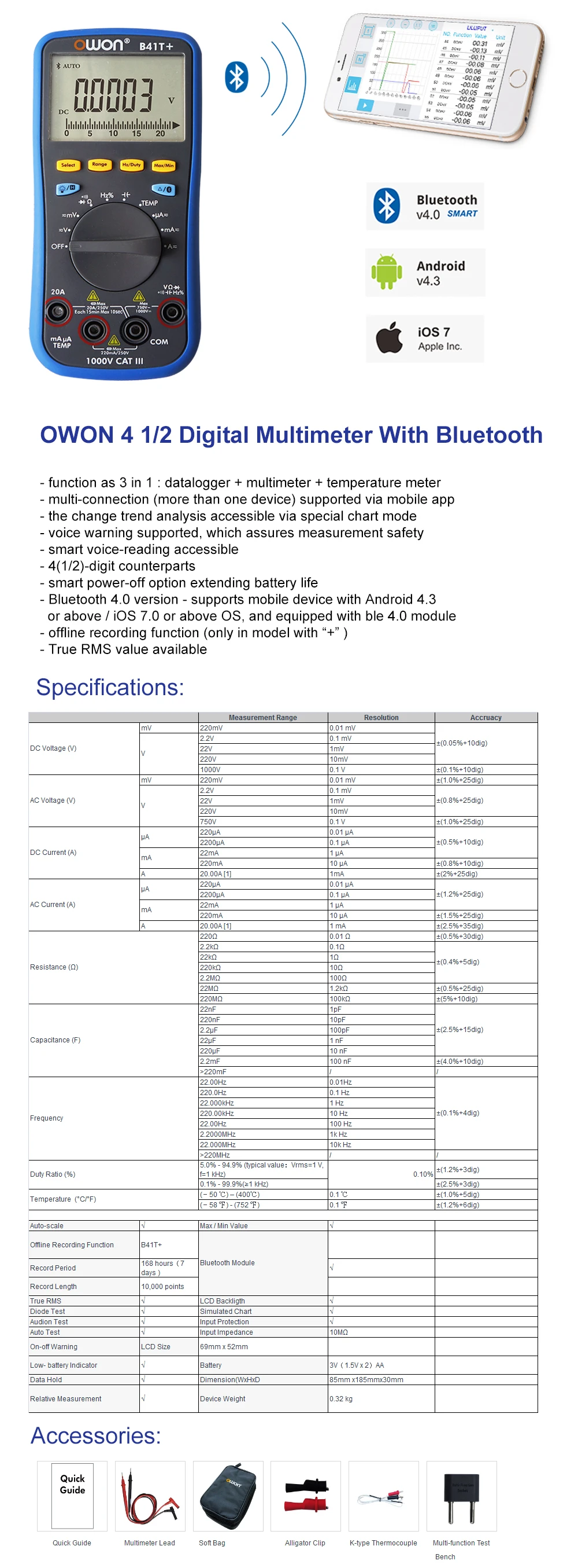 Цифровой мультиметр OWON B41T + 4 12 с Bluetooth, измеритель подсветки истинного среднеквадратичного значения