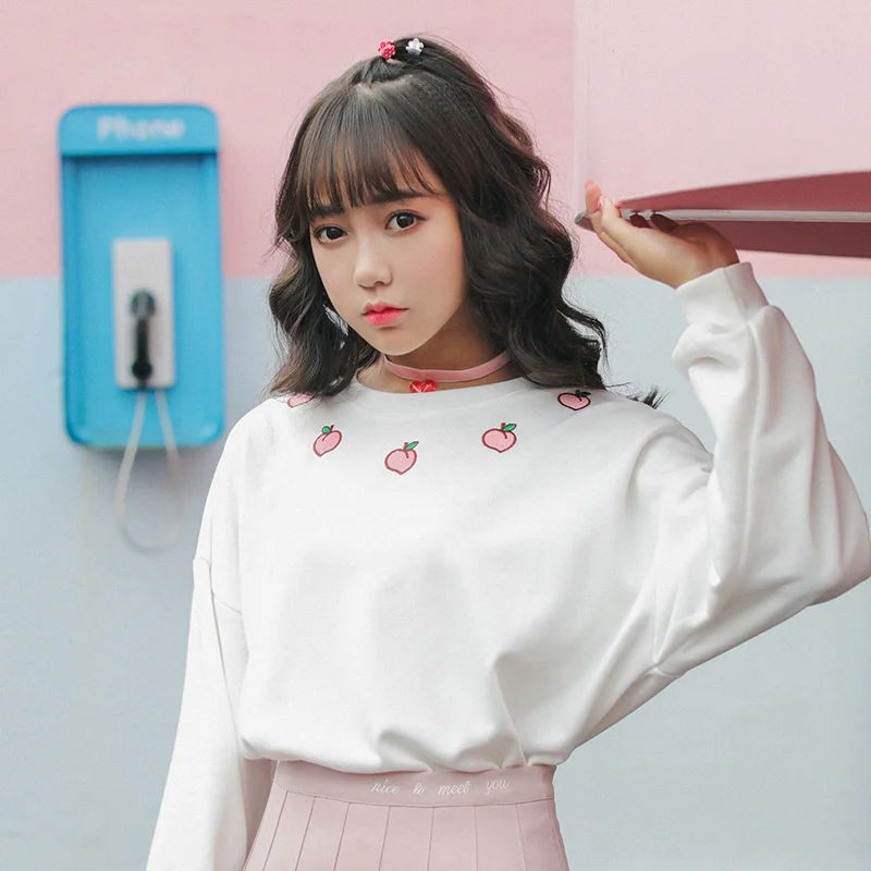 Женские толстовки в японском стиле Харадзюку, универсальная Свободная Толстовка для колледжа с персиковой вышивкой, Женский свитшот для женщин