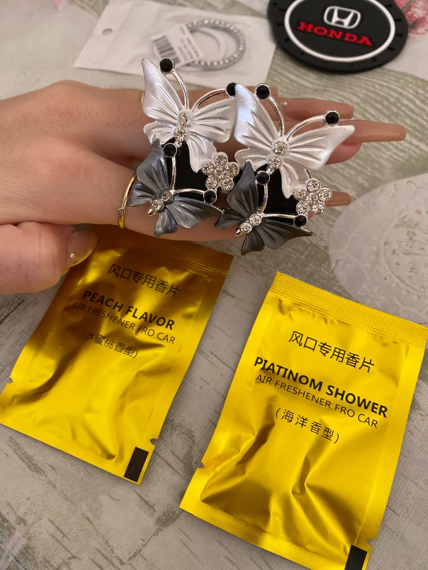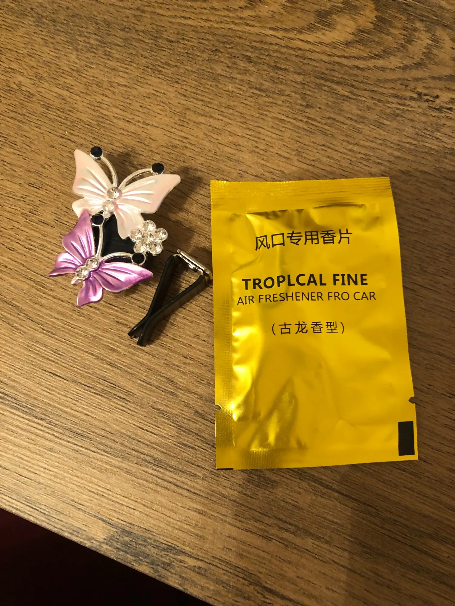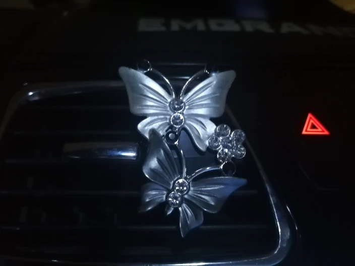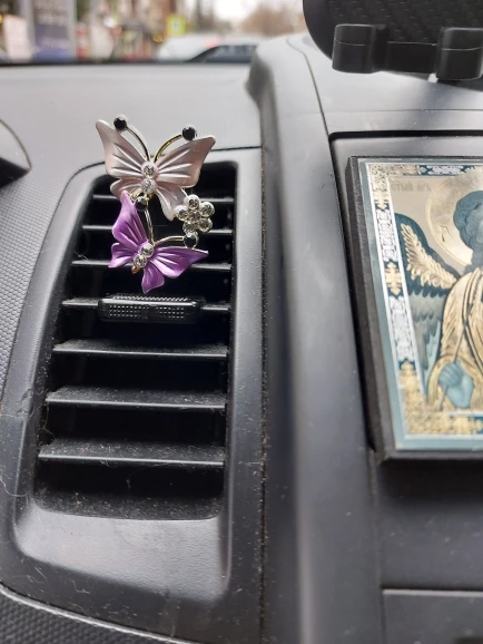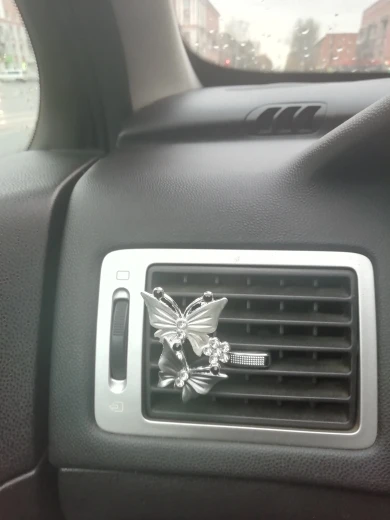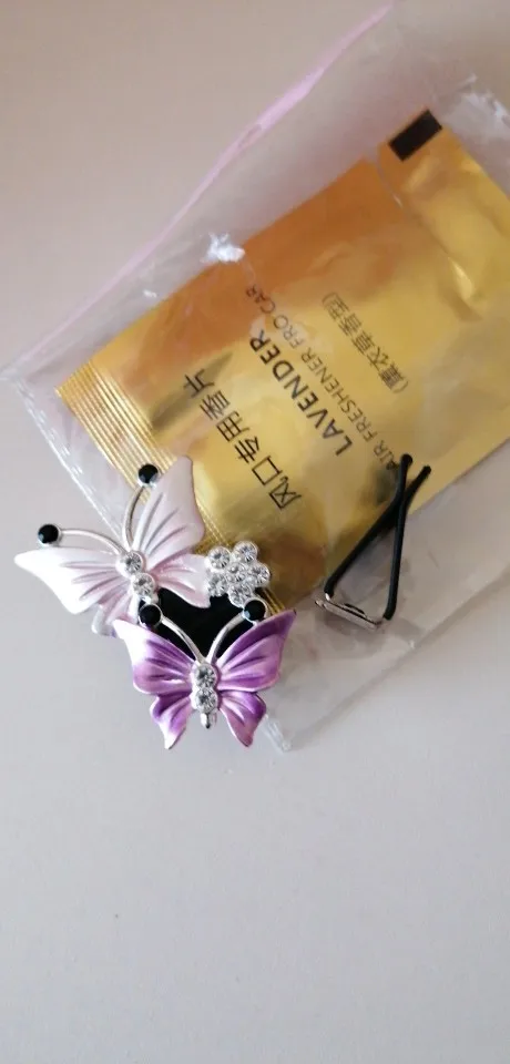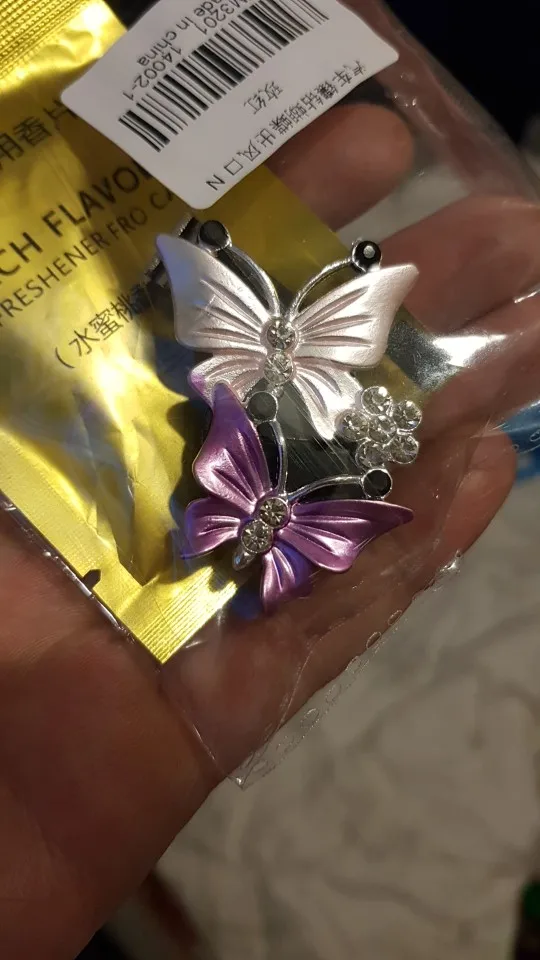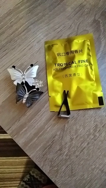 Вполне милое украшение в машину. Вблизи выглядит не очень, но на расстоянии красиво. В комплекте две пахучие таблетки-вкладыши, которые почти не пахнут, хотя и очень обильно пропитаны пахучкой. Посылочка пришла за 20 дней.
