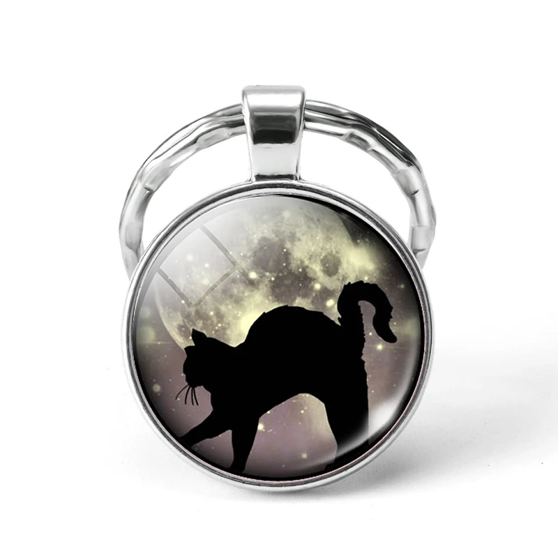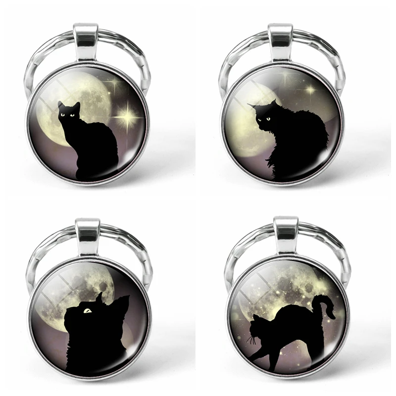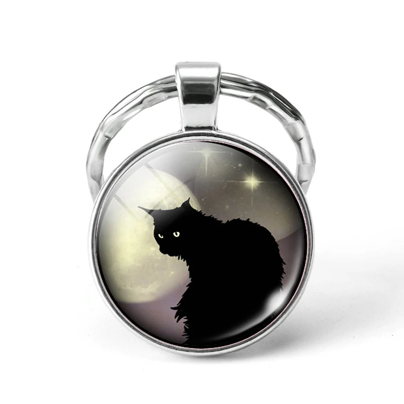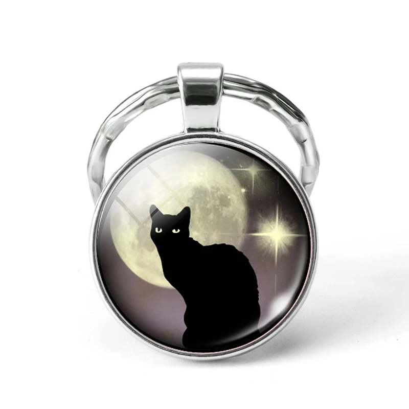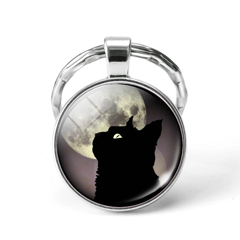 Брелок для ключей сделай сам, черный, кошачий, светящийся в глазах, полная луна, фото, стеклянный купол, животное, кольцо для ключей с подвеской, бижутерия, модные аксессуары, подарки