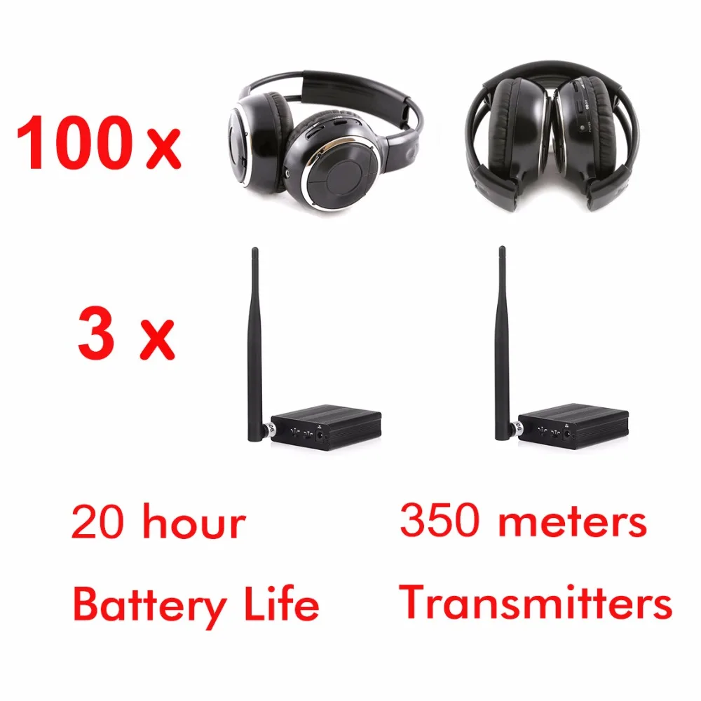100 х складные беспроводные диско-наушники3 x 350mtr передатчики6 xAudio кабели (3 xrca/3x3,5 мм)3 x сетевой адаптер (Великобритания/евро/США/Oz)Все, что вам нужно, это наше здесь!