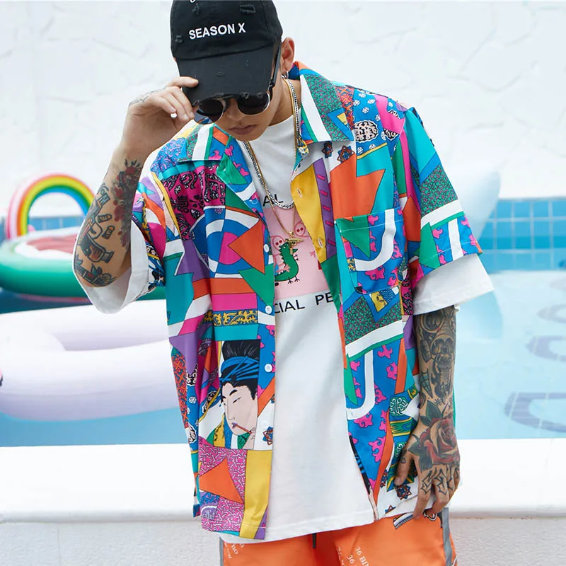 Мужская свободная рубашка в стиле хип-хоп Harajuku, японская рубашка Ukiyo E Anime, топ с короткими рукавами, гавайская рубашка, Повседневная Уличная одежда, тонкая летняя 2021