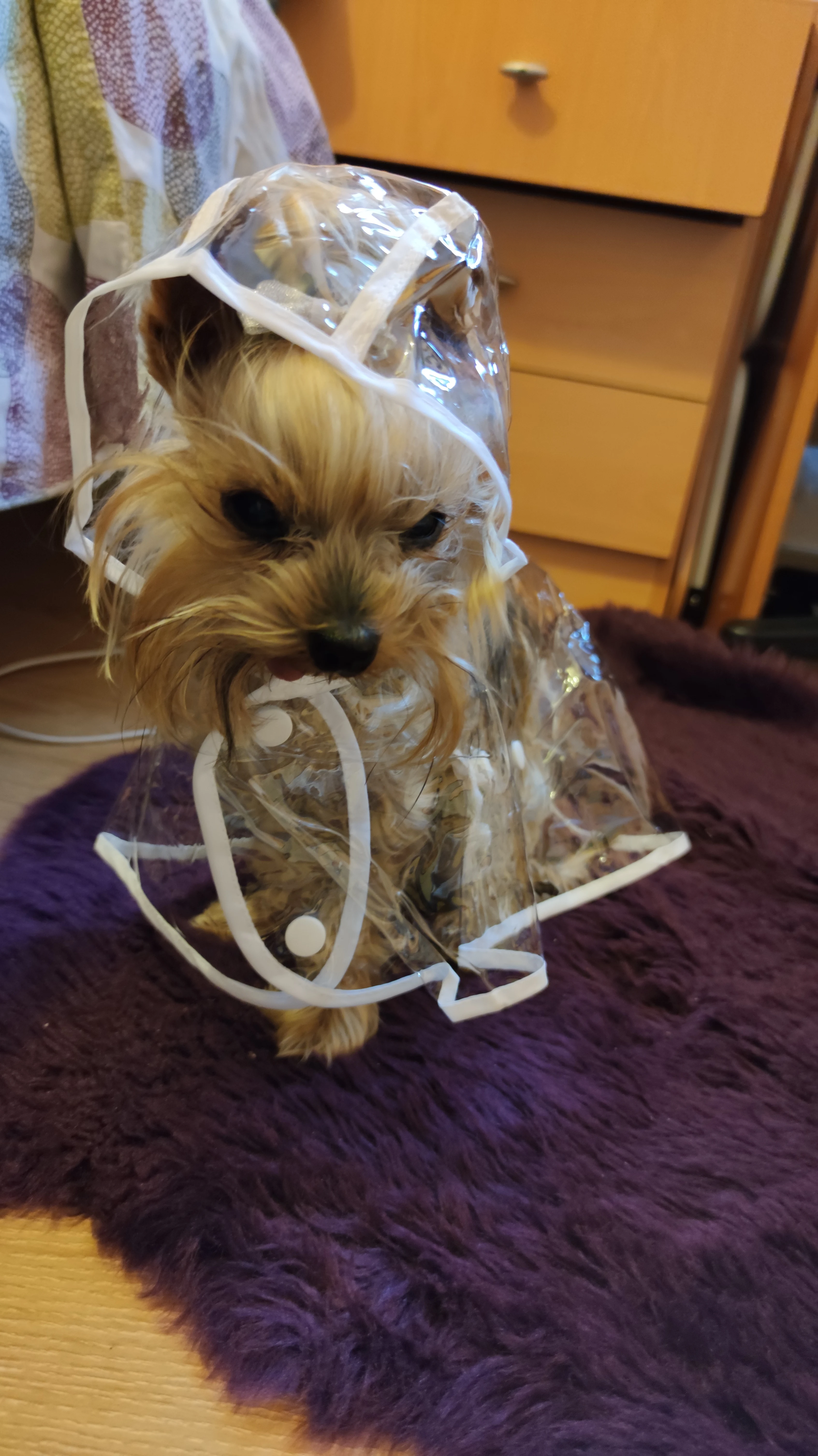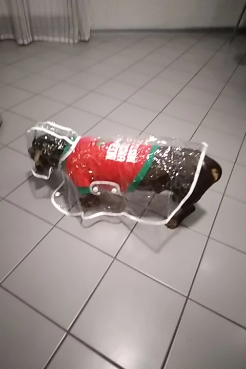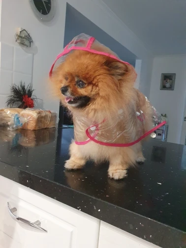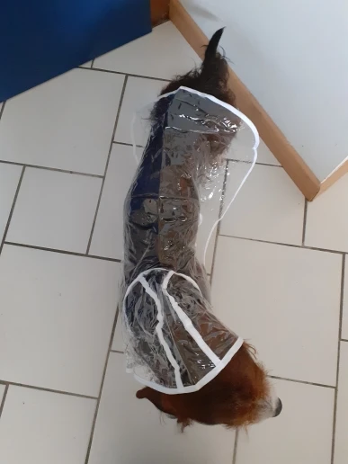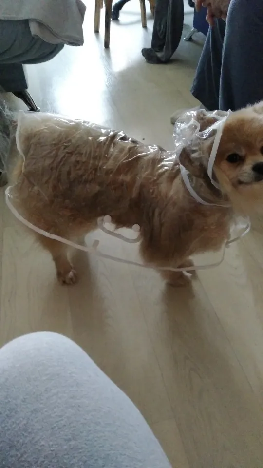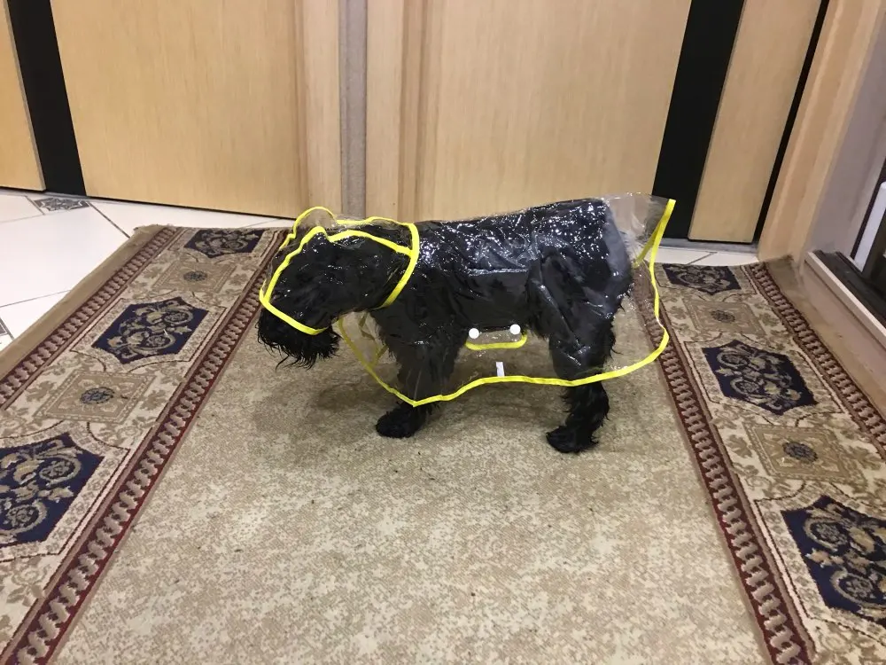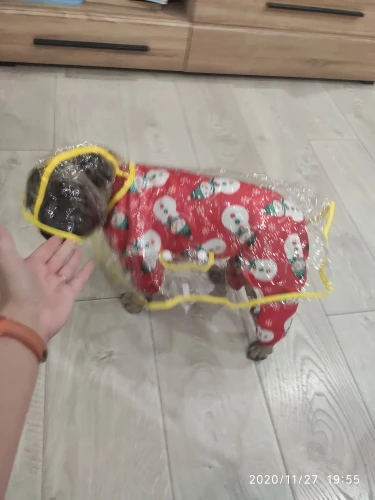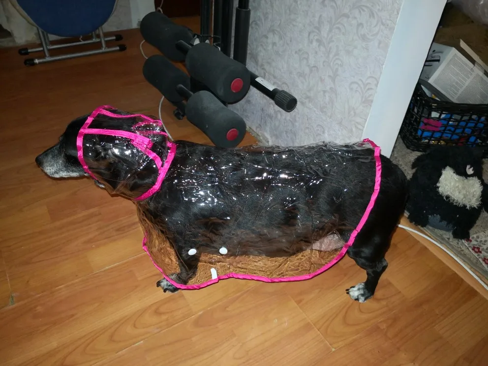 быстро пришёл дождевик, даже не прослеживала а когда за глянула где он, не ожидала что он уже на почту пришел. Классная штучка, правда не много коротковат для моей собаке , лапки не много не закрывает а так все хорошо и по размеру подошёл, на нём. шпица в холке 28см.и на 5.5кг XL самое то. Правда стояла как в копанная. Надеюсь что привыкнет.