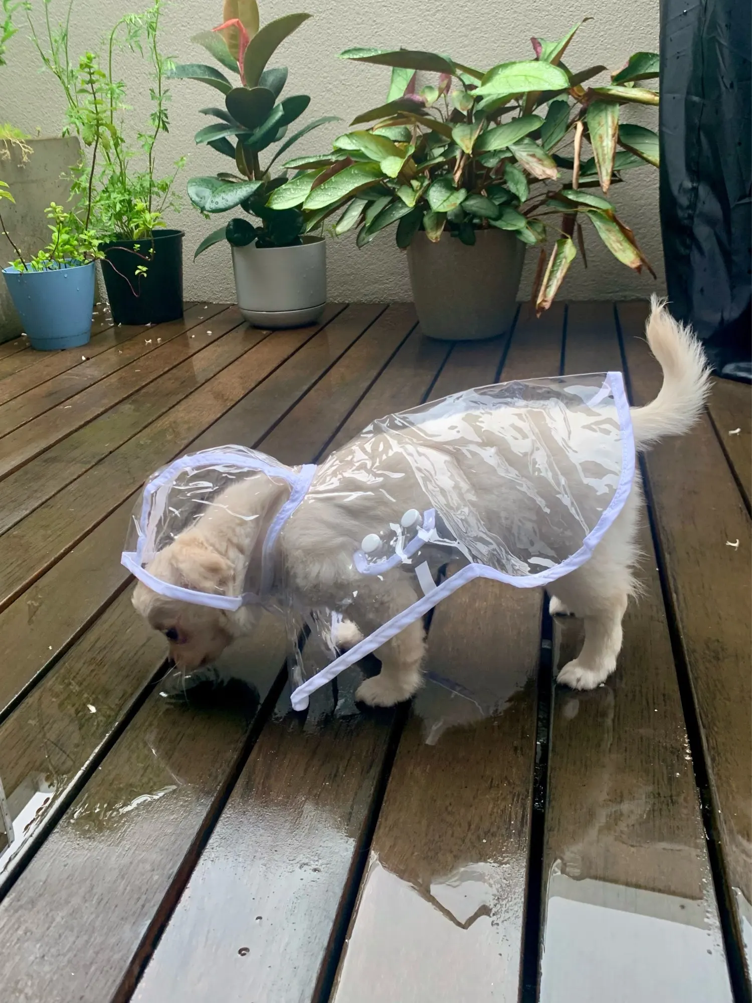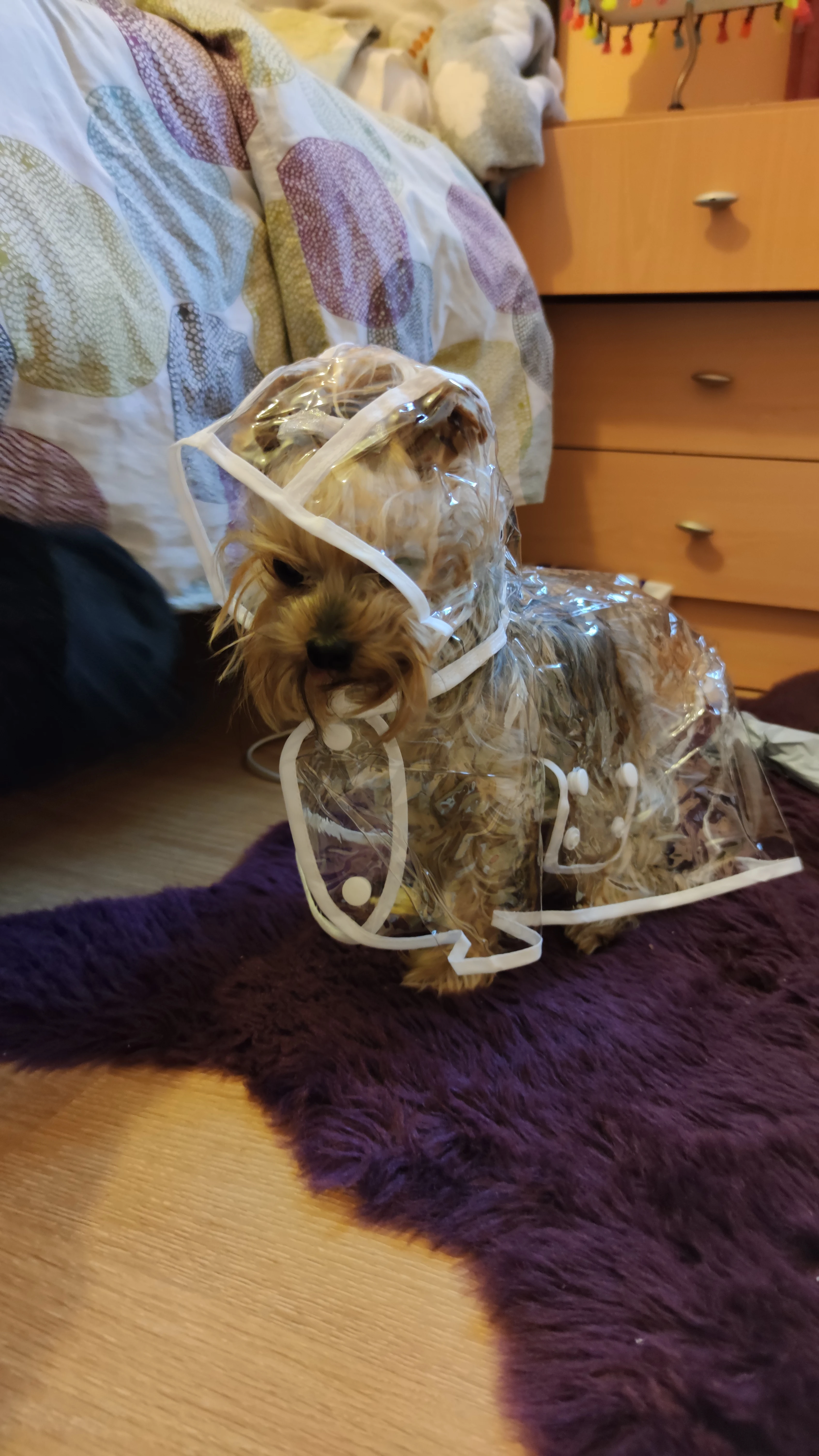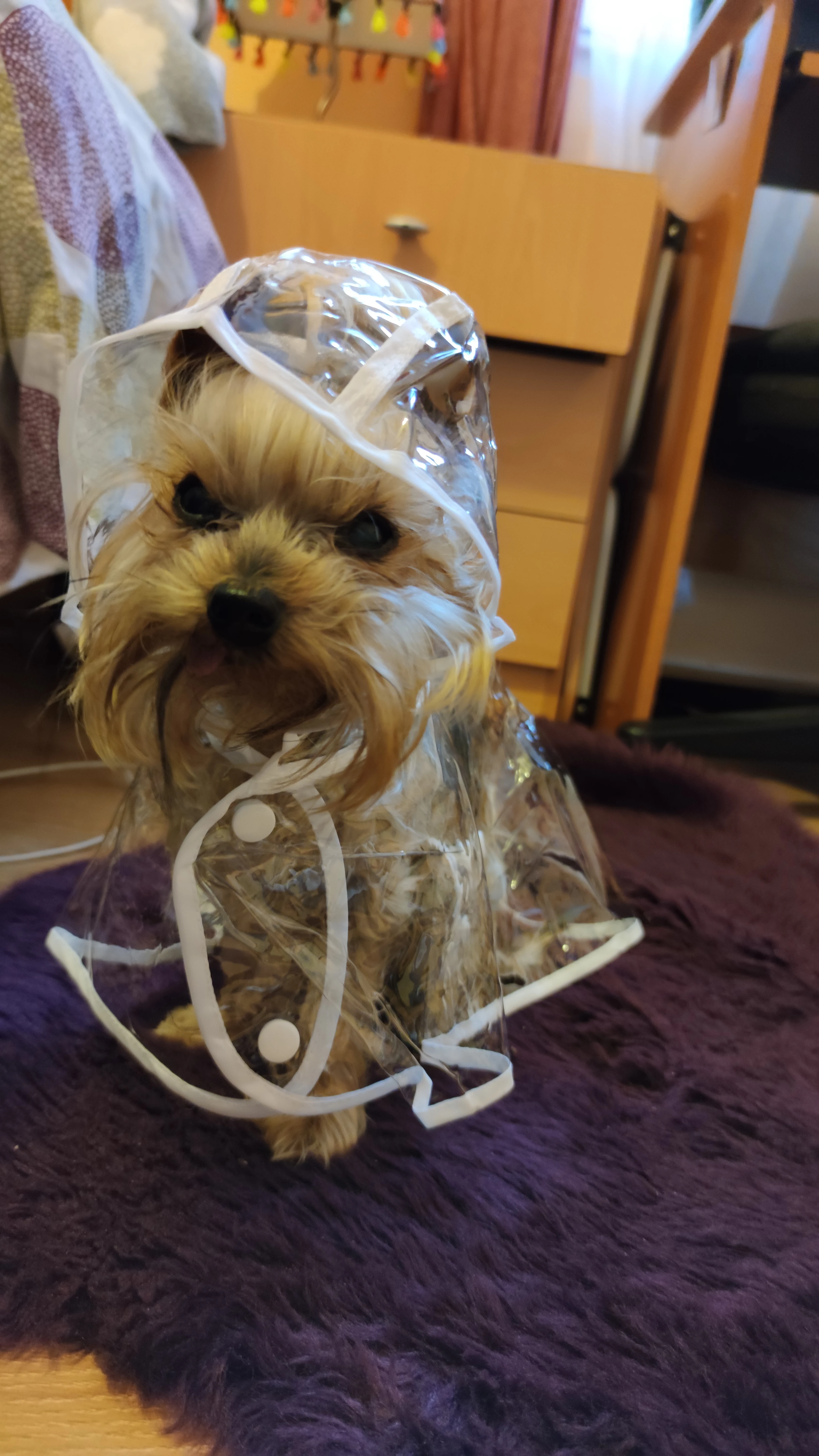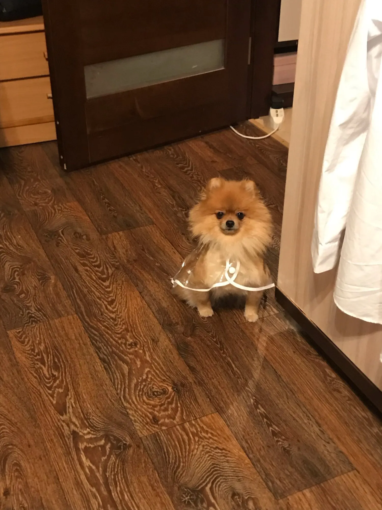 быстро пришёл дождевик, даже не прослеживала а когда за глянула где он, не ожидала что он уже на почту пришел. Классная штучка, правда не много коротковат для моей собаке , лапки не много не закрывает а так все хорошо и по размеру подошёл, на нём. шпица в холке 28см.и на 5.5кг XL самое то. Правда стояла как в копанная. Надеюсь что привыкнет.