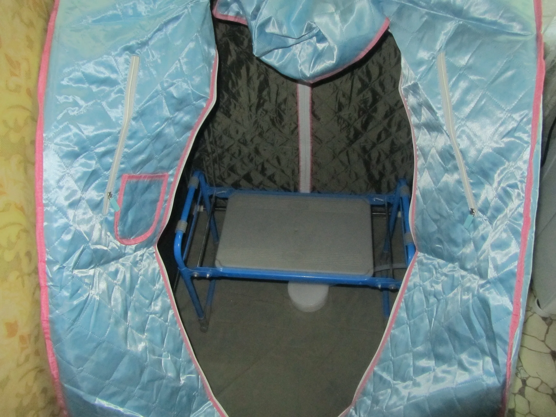 Заказывал в Киев. Получил в отделении Новой почты бы Приличных размеров коробка, наклейка что внутри хрупкое, но видимо перевозчику плевать было. Угол коробки нехило был сплюснут, видимо бросили с высоты не меньше метра 2. Внутри всё было цело, благо продавец упаковал парогенератор в пленку с пупырышками. При первом включении вообще не включился парогенератор. Открутил три винтика, внутри две платы и нагреватель как у чайника. Видимо от удара просто выскочил один из разъемов (хотя они должны крепко заливаться, но увы, просто вставили и не зажали. Вставил, включил, всё заработало. Парит отлично, полный релакс. Никакая это не сауна и не русская баня. Это чистой воды турецкий хамам. И по температуре, и по влажности, и по принципу работы. Сидеть можно долго. Рост у меня 197 см, так что на табуретке не получается внутри сидеть, нужно чтобы высота сиденья стула или стульчика была не выше 35-37 см. Иначе не застегнуть. Купил такой раскладной рыбацкий стул со спинкой и подлокотниками в Эпицент