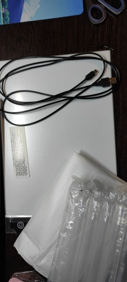 До МСК пришел за 2 недели. Упаковано отлично: в мягкий пакет с воздушной подушкой и плотно закреплено коробкой, поэтому можно не боятся, что с планшетом что-то случится. Сам планшет хороший: тонкий, нетяжелый, вроде достаточно крепкий. На поверхности защитная пленка. Не знаю, почему, но под пленкой светит планшет намного ярче, чем без нее. Это видно, если немного отклеить пленку и сравнить. Решил оставить пленку, чтобы яркость не терять.(только оттерла ацетоном) Бумага просвечивает хорошо, в том числе плотная акварельная.