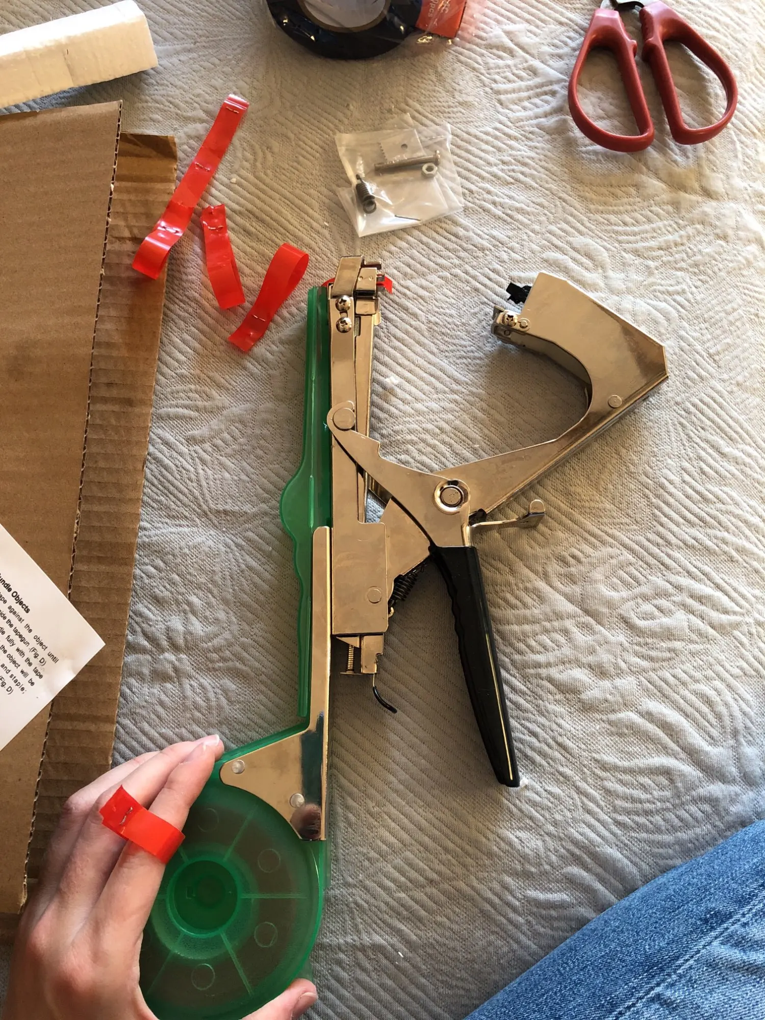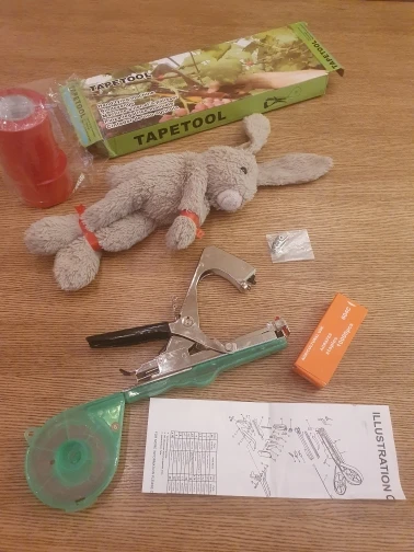 Домашние цветы подвязал будем ждать лета. Лента прочная и её очень много. Работает в два приема лёгкое нажатие сведение и захват ленты, потом обхватываем то что надо подвязать и ещё один нажим посильней и степлер скрепляет ленту скобой.