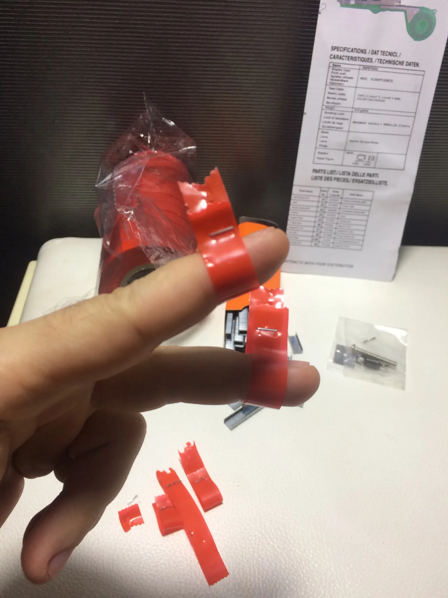 Доставка на Украину 2 недели. В комплекте есть запасная пружинка и лезвие. Инструмент заряжен мотком красной ленты и скрепок штук 40, для пробы и испытания. У меня всё работает. С продавцом общаться не было необходимости.