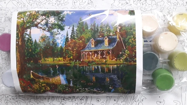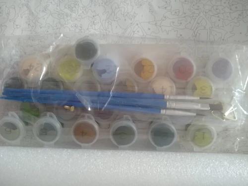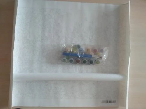Набор стандартный: холст, кисти, краски, крепления, есть маленькая картинка, а контрольного листа нет (вобщем всё как всегда). Упаковано тоже стандартно: холсты на валике, и все в пупырчатом пакете, но доехало все целое и невредимое.