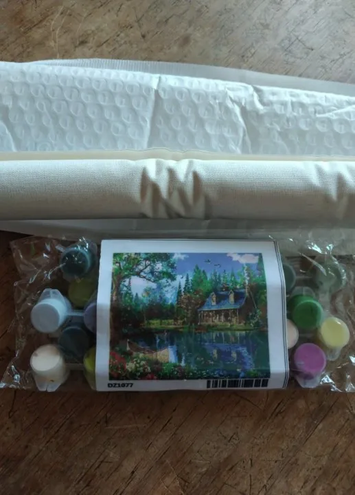 Доставка в Омск месяц. Холст намотан на валик, в комплекте 2 петли и несколько гвоздиков. Жена в восторге, говорит кисточки удобные.