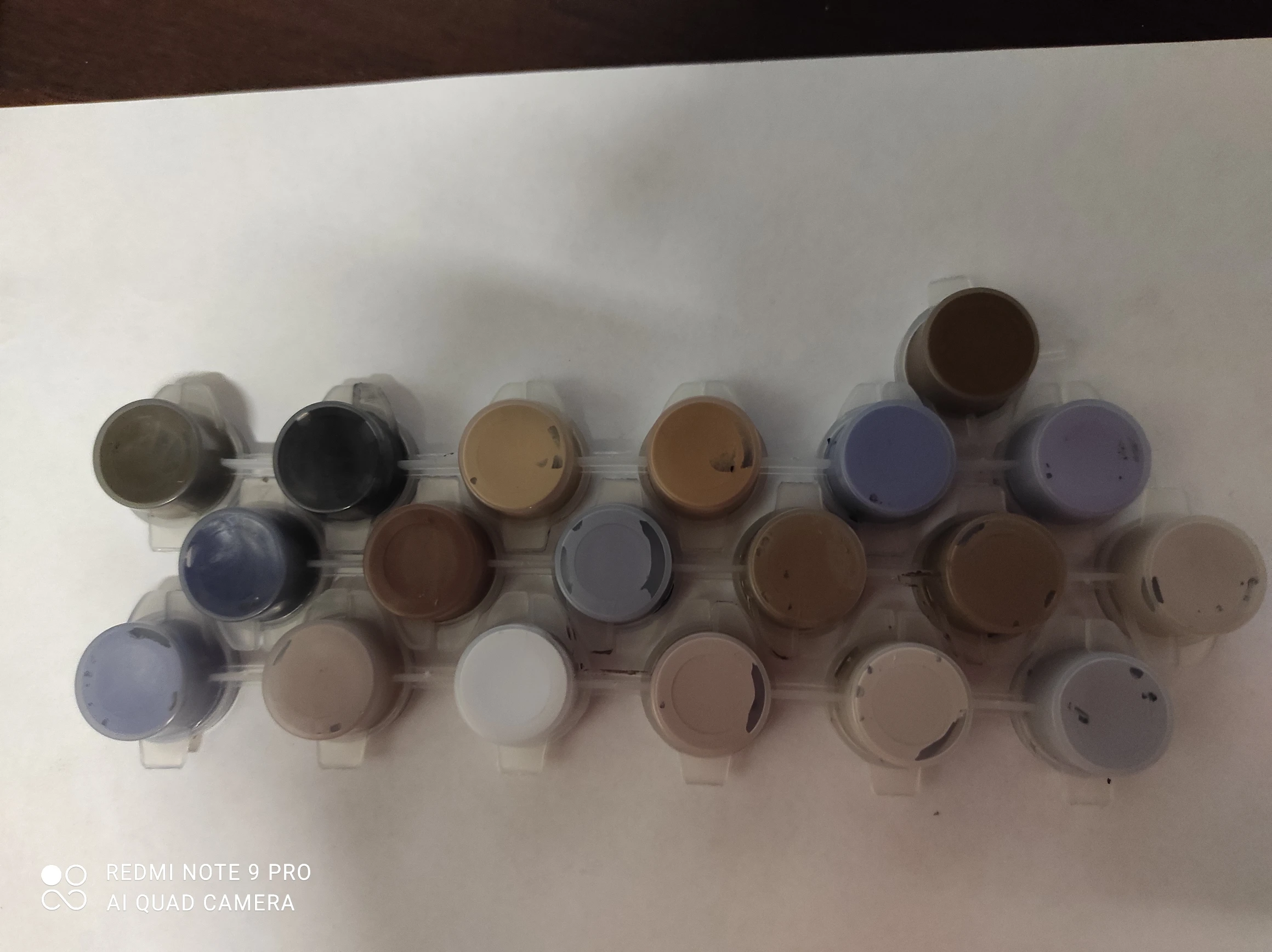 доставка немного более месяца,пришло немятое,краски,кисти, крепеж и маленький цветной образец. будем рисовать.
