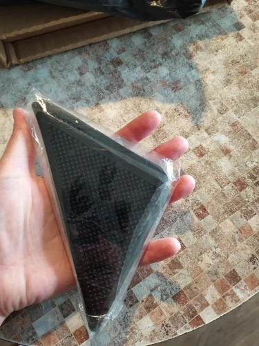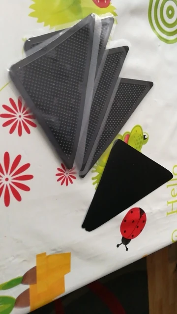 Маленький коврик (не более 1 метра) удержит, большой нет. Чем больше ковёр, тем больше нужна площадь липкая - не ждите чуда. Мелкие уголки не смогут держать большой ковёр. Состоит из 2х частей, каждой по 4 шт. Липкую тонкую пластину нужно клеить на ковер, а на эту пластину уже силиконовую.