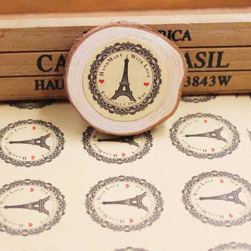 200 шт. винтажная серия "ручная работа", Крафтовая печать, наклейки для подарков DIY, самоклеющиеся этикетки с принтом Эйфелевой башни, круглые этикетки 3,8 см